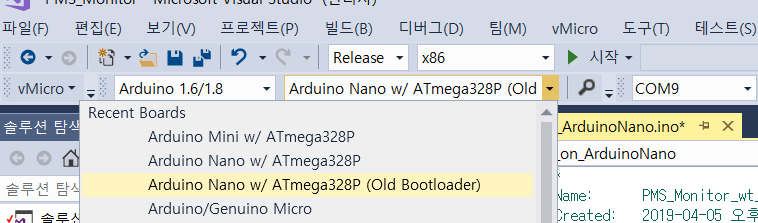 아두이노 코드역시 우노버전과 동일합니다. 다만 컴파일 및 업로드시에 Visual Studio에서 설정만 약간 다르기 때문에 그 부분만 추가로 언급하겠습니다.