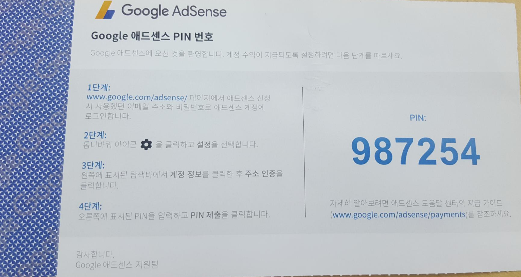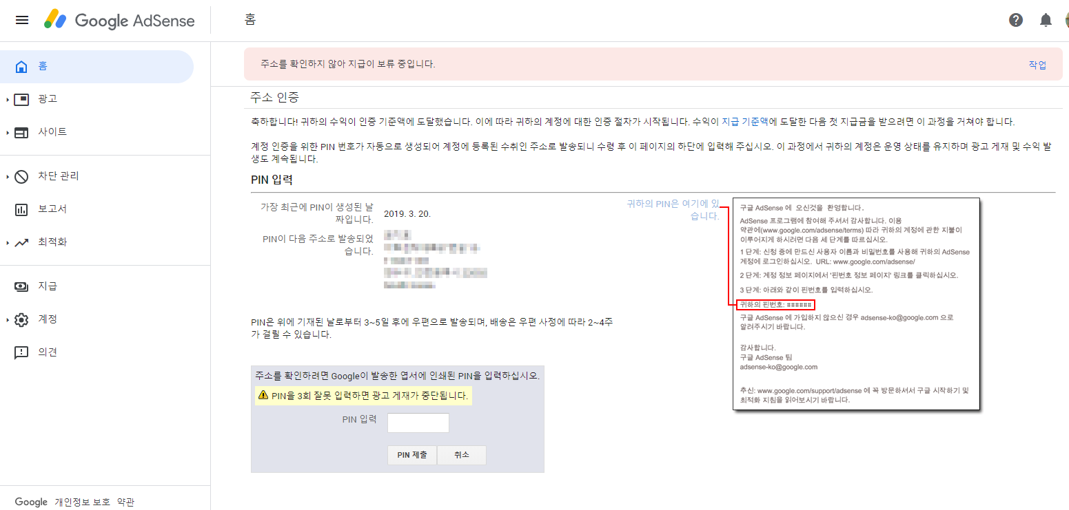 중요한건 여기 있는 핀번호죠. 이 번호를 애드센드 해당 부분에 입력해 주면 인증이 완료됩니다.