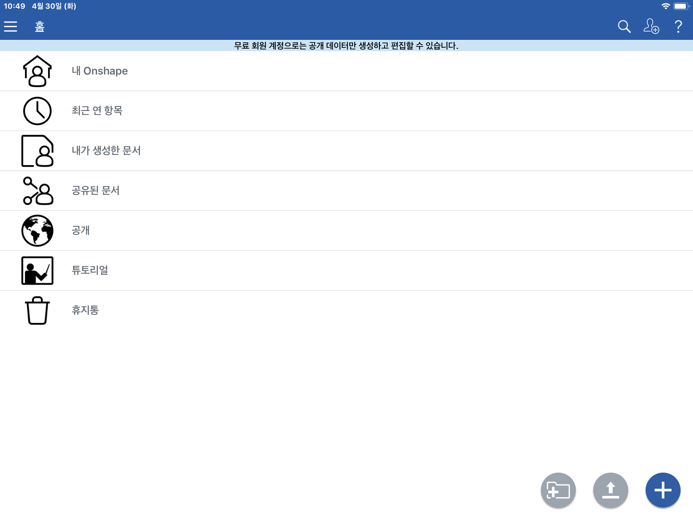 화면에서 보시는 것처럼 무료계정을 사용하게되면 공개데이터만 생성하고 편집할 수있다는 문구를 보실 수 있는데요. Onshape를 무료로 사용할 수 있는 대신 모든 작업결과들은 서버에 공개됩니다.