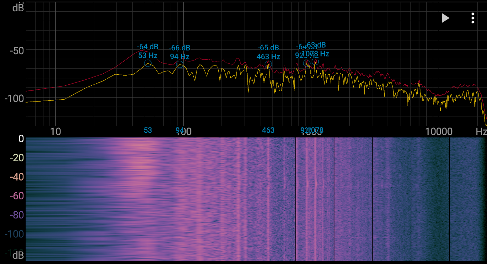 핸드폰 어플로 측정한 결과인데 4개의 뚜렸한 피크를 볼수 있는데 아마도 저 피크가 팬소음인것 같습니다. 작업 후 어느정도 효과가 있는지 비교해보도록 하겠습니다.
