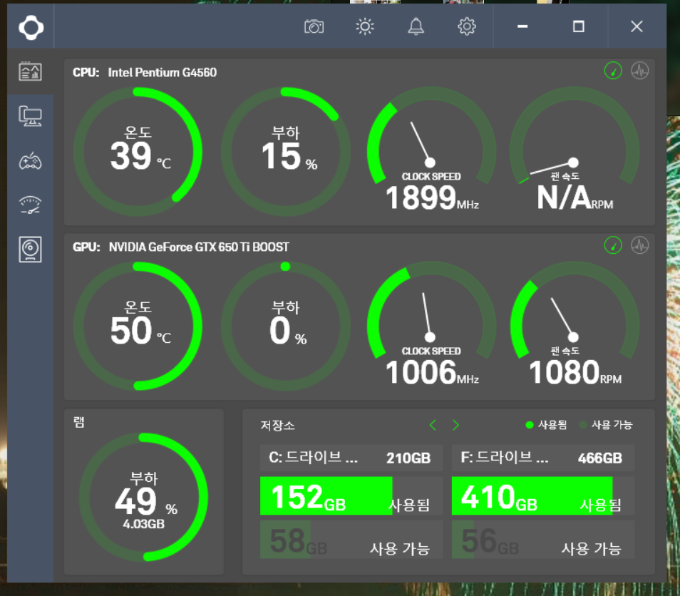 CPU부하는 10%대에 머무르는 어느정도는 아이들 상태라고 볼수 있는 상황인데 CPU온도가 39도정도 유지되고 있네요. 온도가 그리 높지 않은데 팬에서 그리 심한 소리가 난다는건 확실히 팬에 문제가 있기는 한 것 같습니다.