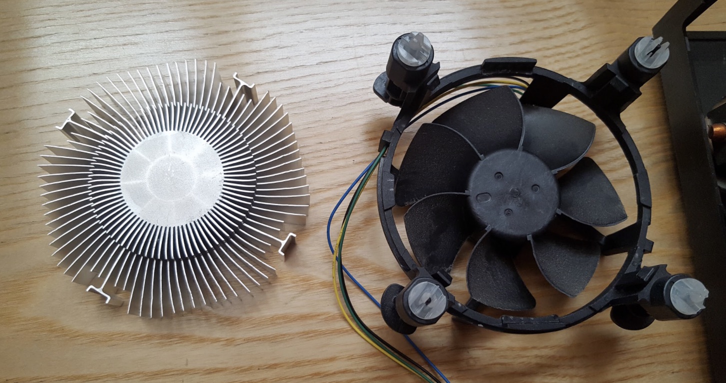 팬과 방열판을 분리한 상태입니다. 그리스는 적당히 촉촉한 상태였고 방열판에 낀 먼지도 거의 없고, 정말 팬이 문제가 있는것 같습니다.