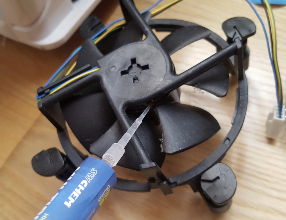 그런데 어?! 팬에 스티커를 다 때봤는데 오일을 주입할 수 있는 구멍이 전혀 없습니다. 알아보니 오일주입구가 없는 밀폐형 베어링을 사용하는 팬이 있다고 합니다. 이런경우에 구멍을 뚫어서 오일을 주입하라는 사람도 있긴하던데, 그렇게 까지 할 자신이 없네요.