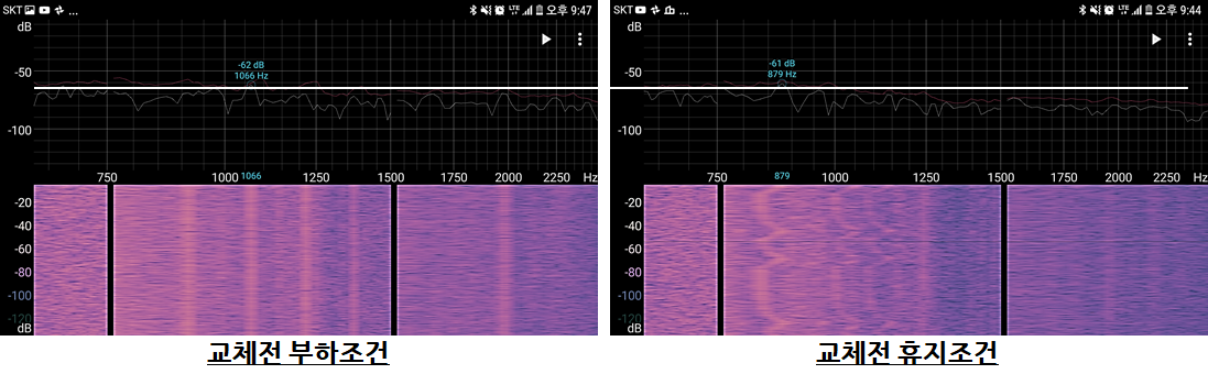 그런 여러가지를 감안하여 교체전 휴지상태에서의 소음과 교체후 부하조건 및 휴지조건의 3가지를 동시비교 해봤습니다.