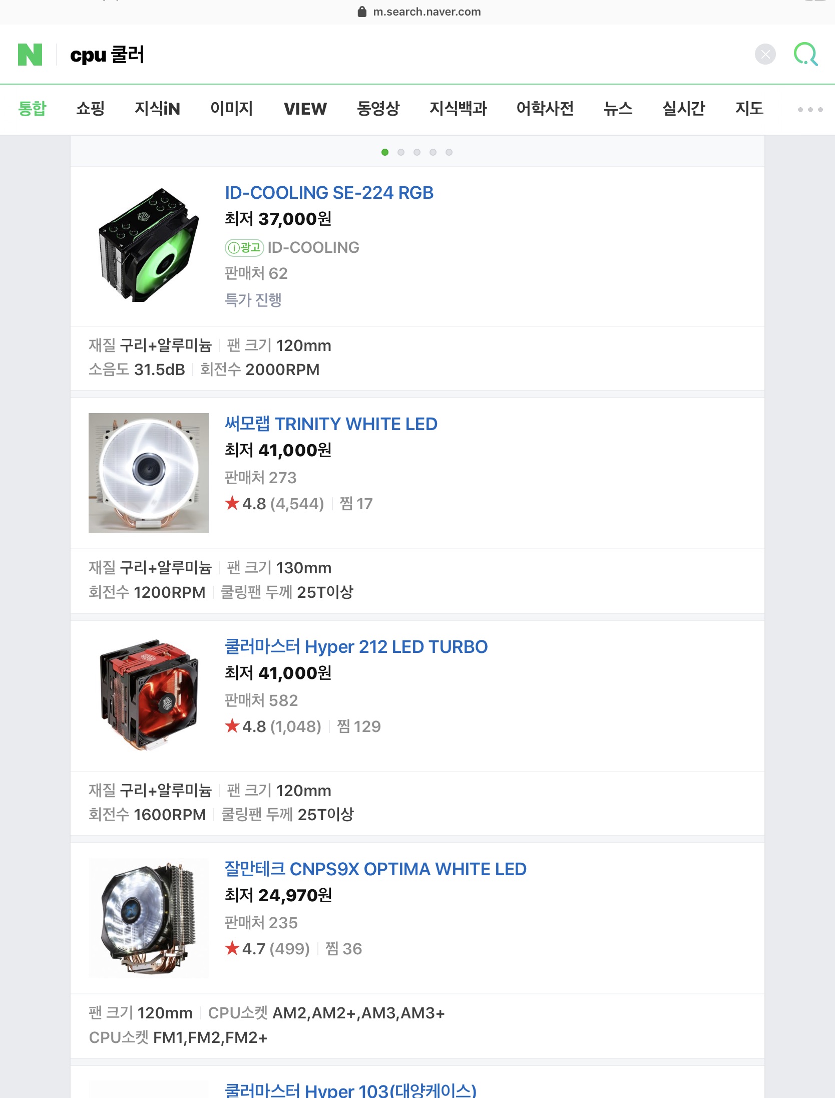 CPU쿨러는 어떤제품이 있나 검색을 해 봤습니다. 네이버에서 단순하게 cpu 쿨러라고만 검색해 봤습니다.