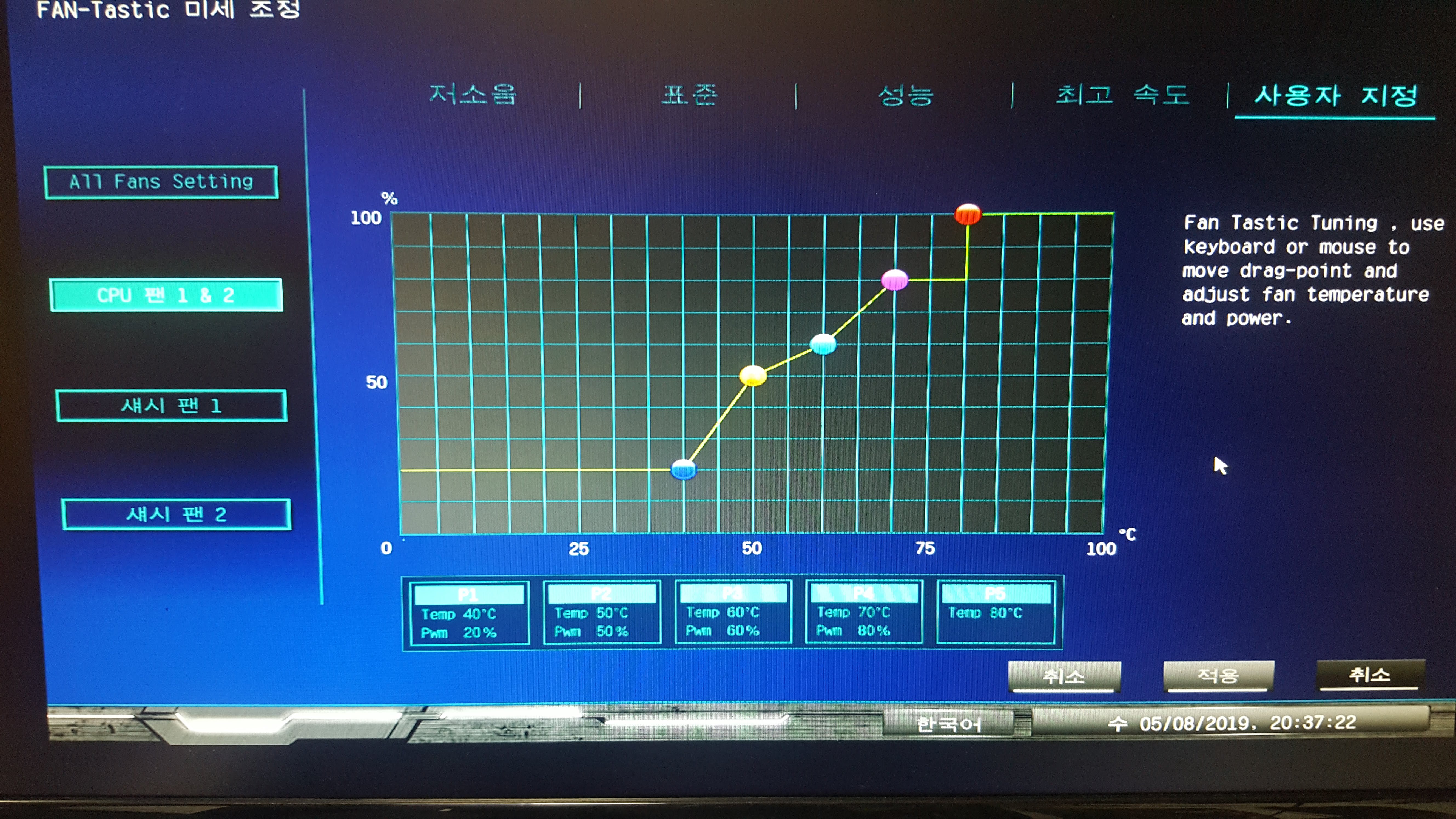 쿨러를 교체하기전에 저소음의 효과를 극대화 하기 위해서 CPU팬 속도를 조금 조절했습니다. 먼저 CPU휴지상태에서는 보통 40도 미만의 온도가 유지되는것 같아 팬속도를 20%로 줄였고 50, 60, 70도에서 차등적으로 팬속도를 높였지만 원래 사용하던 패턴보다 더 저속으로 줄여주었습니다. 마지막으로 풀스피드는 80도 이상에서 돌도록 해 주었습니다.