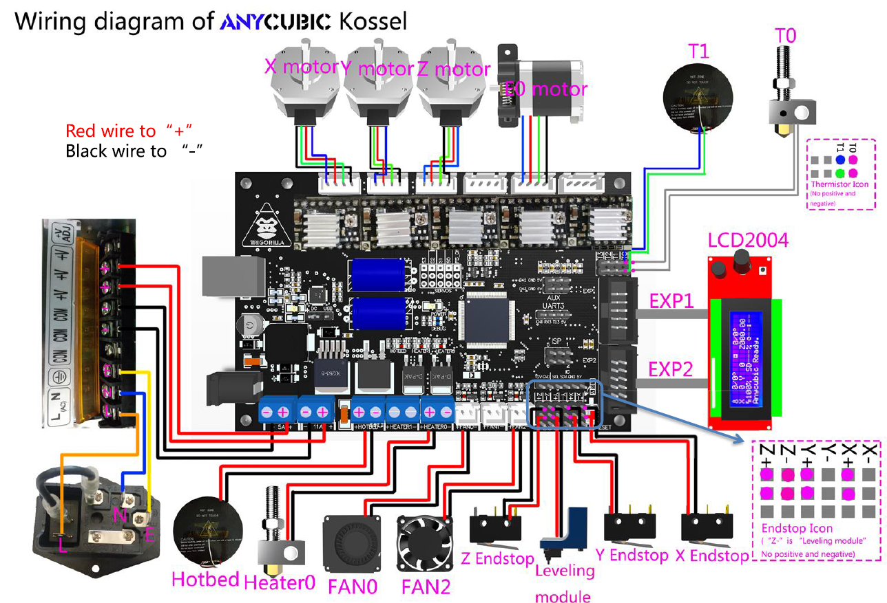 그림을 확대해서 보면 "Leveling module"이라고 된 아이가 "Z-"라고 인쇄되어 있는 단자에 연결되도록 되어 있는 것을 볼 수 있습니다. 그리고 표현상 빨간색과 검정색으로 두 선을 구분해 두었는데 실제로는 open/close 스위치라서 극성은 중요치 않습니다.