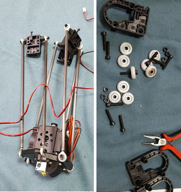 다음사진은 조립된 Diagonal 로드/로드마운트와 익스트루더세트(좌) 그리고 풀리가이드(?)(우)입니다. 풀리가이드는 조립당시에 재질이 플라스틱이고 조금 낭창한 느낌이라서 내구가 우려스러웠는데 다행히 지금까지도 잘버텨주고 있습니다.