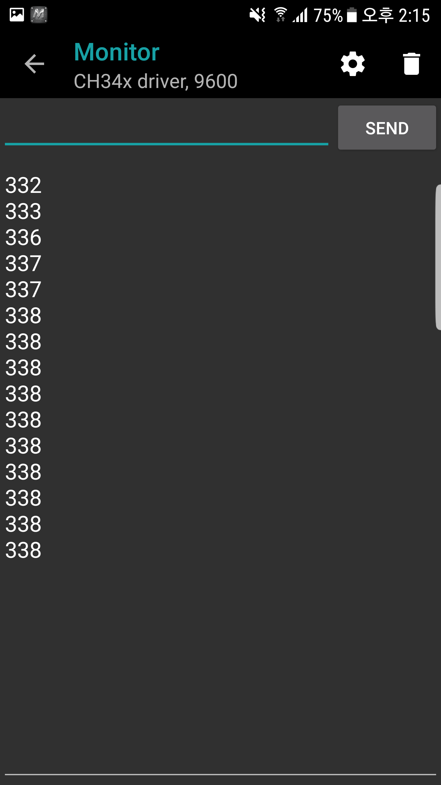이제 잘 동작을 하는지 시리얼 모니터를 실행해 보면 다음과 같이 모니터링도 잘 동작하는걸 알 수 있습니다. 우측상단에 톱니바퀴모양을 눌러서 Baud rate조정 가능합니다.