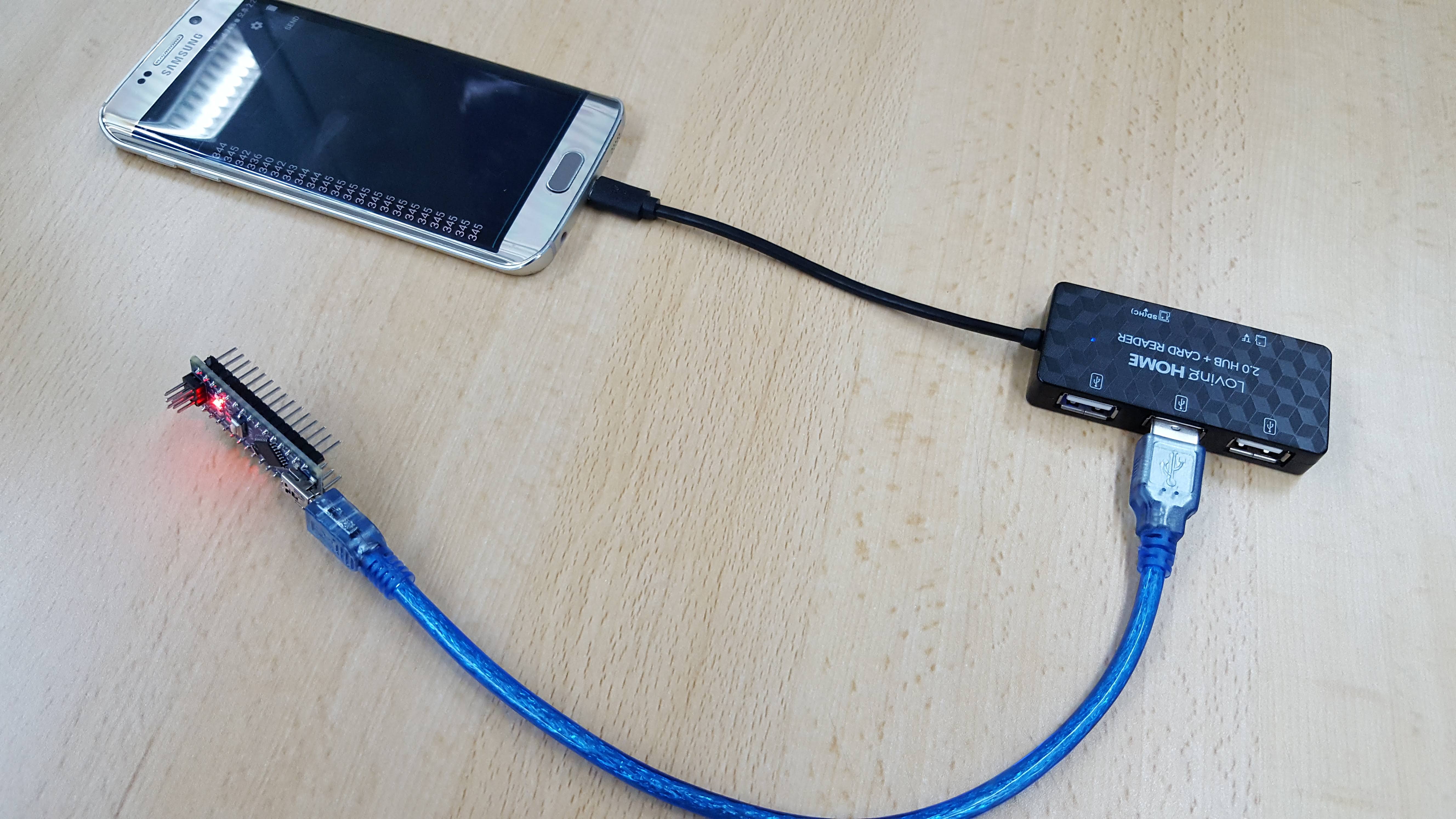 아두이노 보드와 연결을 위해서는 다음과 같이 OTG USB허브가 필요합니다. 아두이노 나노 호환보드가 연결된 모습입니다.