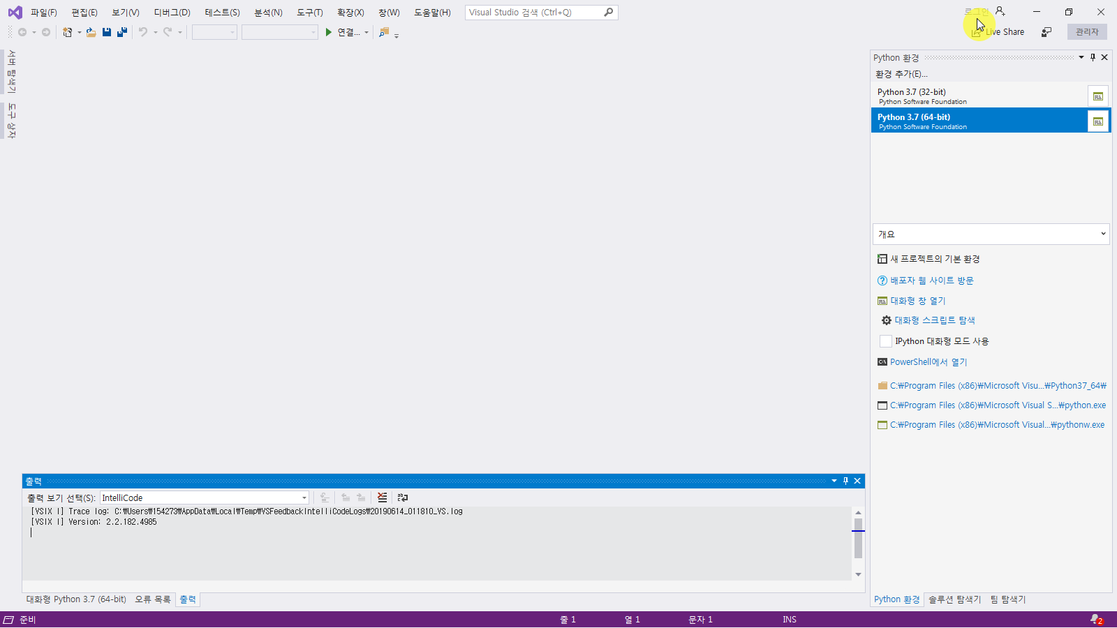 그런데 그리고는 아래 그림처럼 VS가 그냥 뻗어 버렸습니다. 모든 환경에서 동일한 에러가 방생하는건 아닌것 같습니다. 저도 2대의 PC에 설치를 했는데 한대는 문제없었습니다.