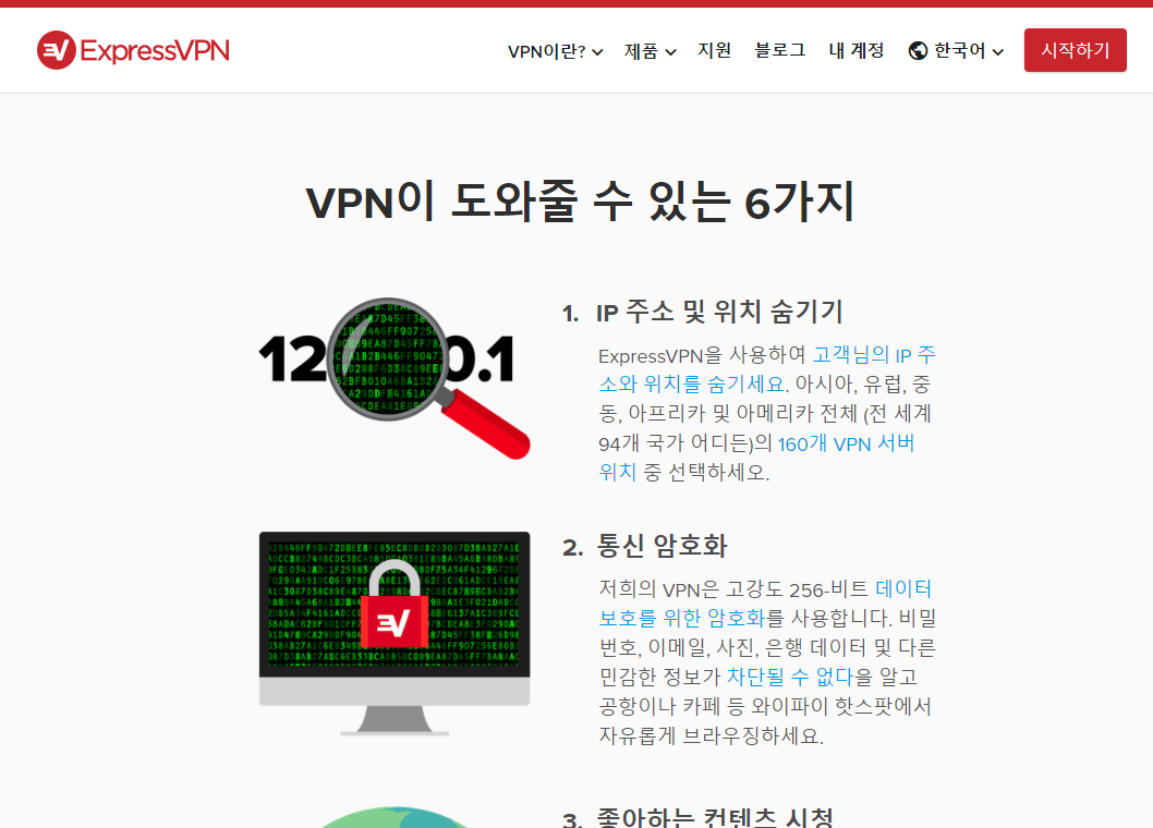 아래 캡처 그림은 대표적인 VPN 서비스 중 하나인 ExpressVPN의 홍보페이지 중 일부입니다.