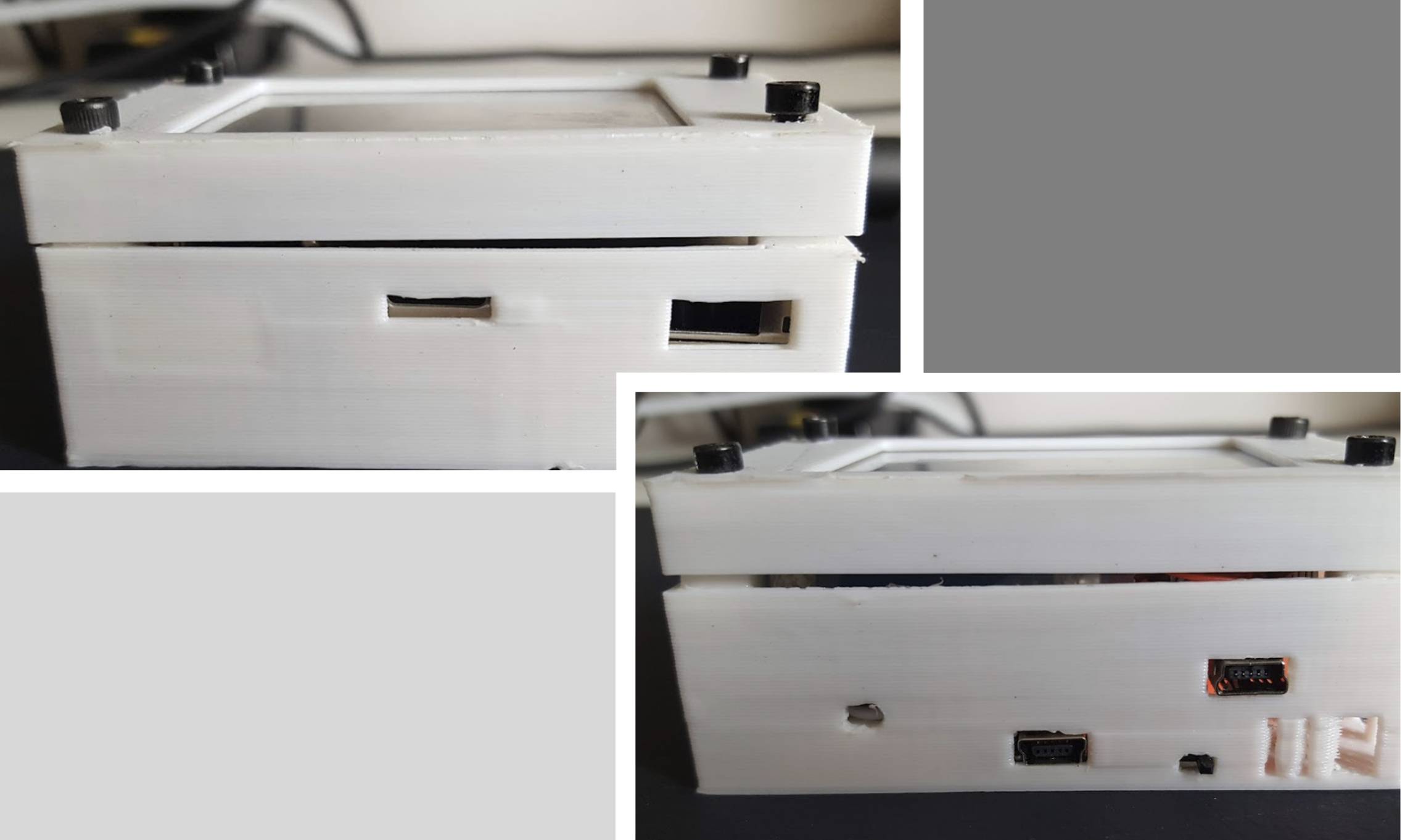위쪽 사진에서 모이는 2개의 구멍은 미세먼지센서의 공기 흡입구와 토출구입니다. 그리고 아래쪽 사진에는 구멍이 어려 개 뚫려있는 데 사용하는 건 3개입니다. 미니 USB 포트는 아래쪽이 충/방전 모듈이라서 충전용 포트이고 위쪽이 아두이노라서 디버깅용입니다. 그 아래 조그마한 스위치는 전원을 켜고 끄는 용도입니다. 처음에 미세먼지 측정기를 구상할 때 스위치 부분은 미쳐 생각하지 못해서 나중에 급조된 부분입니다. 충방전 모듈에서 승압모듈로 가는 전원선에 설치했고 스위치는 케이스 안쪽에 글루건으로 고정했습니다. 젤 왼쪽에 있는 구멍 하나는 스위치용 구멍으로 뚫었다가 고정이 힘들어서 아래로 옮기는 바람에 남아있게 되었습니다. 그리고 맨 아래 우측에 있는 길쭉한 구멍들은 온습도 센서가 위치할 부분이라서 바람구멍으로 뚫어놓은 곳입니다.