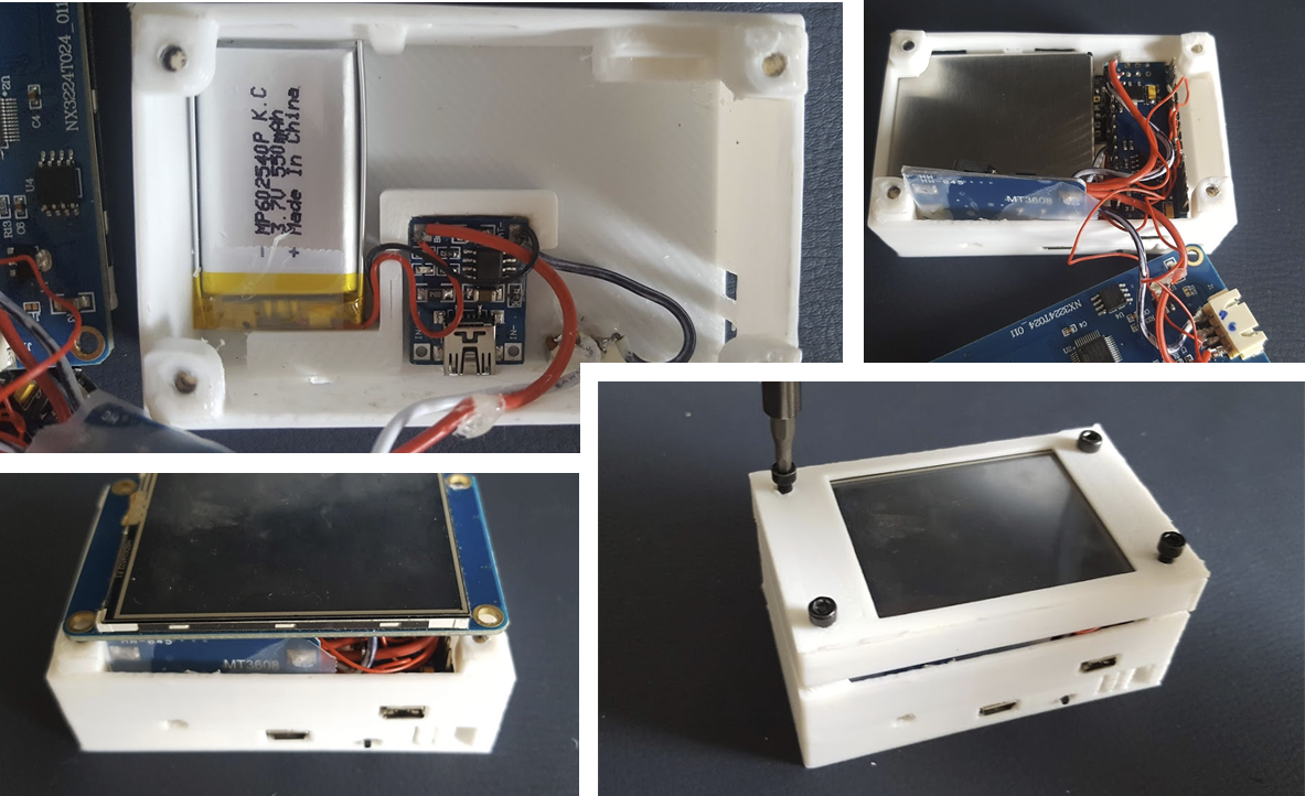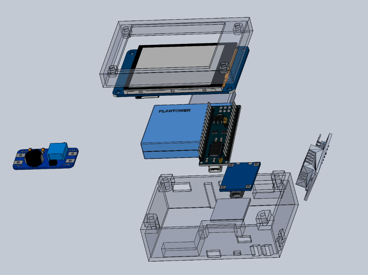 배터리와 충/방전 모듈을 가장 바닥에 위치시켰고. 그위에 미세먼지 센서와 아두이노 나노를 자리 잡도록 케이스를 설계했습니다. 그리고 승압모듈은 케이스 옆에 남는 공간에 그냥 욱여넣어서 별도로 고정은 되지 않는 구조입니다. 마지막으로 Nextion LCD를 올려서 뚜껑 케이스를 덥고 4 모서리를 볼트로 고정하도록 만들었습니다.