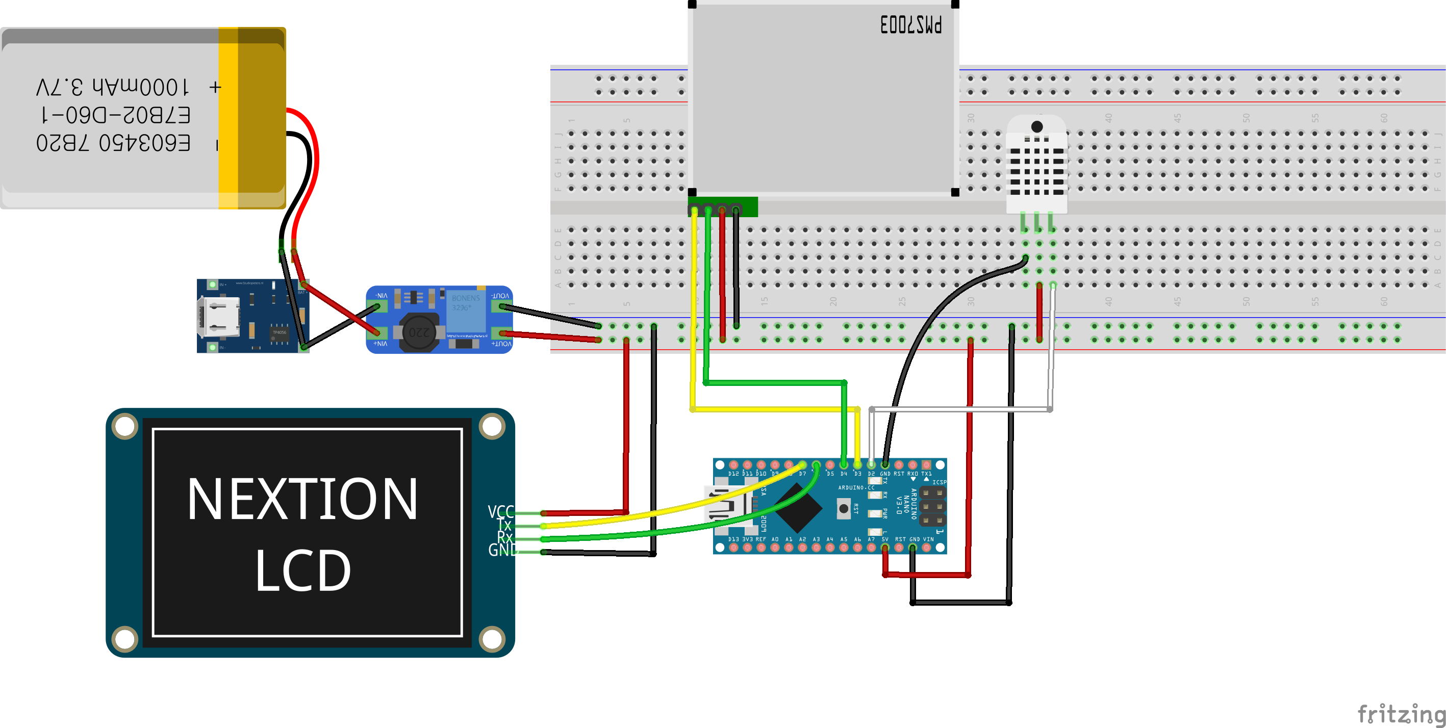아두이노 나노를 컨트롤러로 사용하고 미세먼지 센서는 PMS 7003, 그리고 데이터를 화면으로 표시하기 위해서 Nextion LCD를 사용하였습니다. 단순한 미세먼지 측정기에는 너무 고급사양이긴 하지만 나중에 차차 기능을 추가할 때를 대비해서 고~급 디스플레이 사용했습니다. 그리고 휴대용이기 때문에 리튬이온 배터리를 사용하기 위해서 배터리 및 충전/승압 회로 추가하여 전체 시스템을 구성하였습니다.