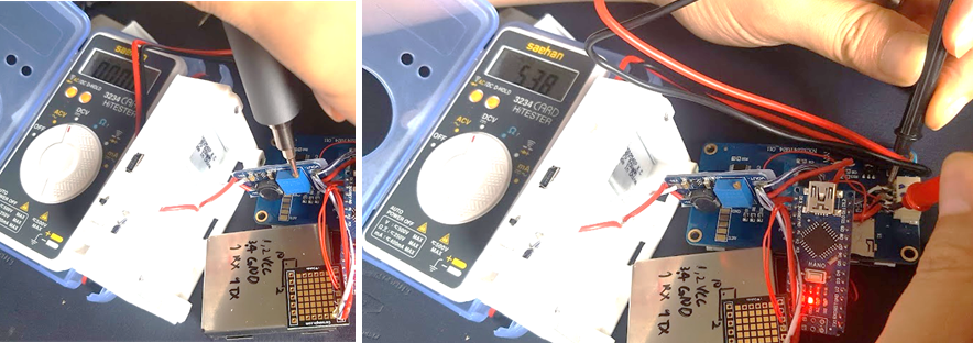 왼쪽 사진에서 드라이버로 돌리고 있는 부분이 승압모듈의 가변저항입니다. 저 나사를 돌리면 출력 전압이 조절이 됩니다. 우측 사진에 출력이 5.38V 나오는 게 보이시죠? 그런데 생각보다 많이 돌려줘야 해서 고장 난 게 아닌가 쫄았었습니다. 이런 류의 모듈을 만져본 적이 없어서 이게 정상인지 아닌지는 모르겠지만 3V대에서 5V대까지 올리는데 10바퀴 이상 돌려 준거 같습니다.