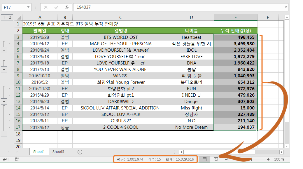 다음과 같이 전체 엘범의 누적 판매량을 알고싶은 경우 간단하게 엘범 판매량이 저장되어 있는 셀 전체범위를 드래그해서 선택만 해주면 프로그램 하단에 그 합계 뿐만 아니라 총 데이터 개수와 평균값까지 바로 보여줍니다. 데이터 작업하실 때 검산용으로 많이들 사용하시죠? (우와~ BTS 앨범이 전부 천오백만장이 넘게 팔렸네요. 정말 대단합니다)
