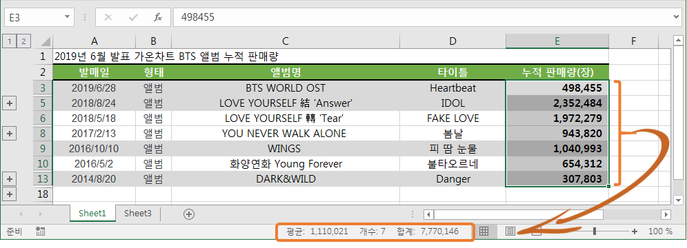 자 여기서 BTS앨범들을 보니 형태분류가 앨범, EP, 싱글 이렇게 3가지 종류가 있는걸로 나옵니다. 여기서 앨범이라고 분류가된 정규앨범의 총 판매량을 알고 싶어서 앨범이라고 된 행을 제외하고 나머지는 모두 숨기기를 했습니다. 그리고 판매량 부분을 모두 선택을 하면 위와 마찬가지로 정규앨범만의 판매량을 알수 있습니다.