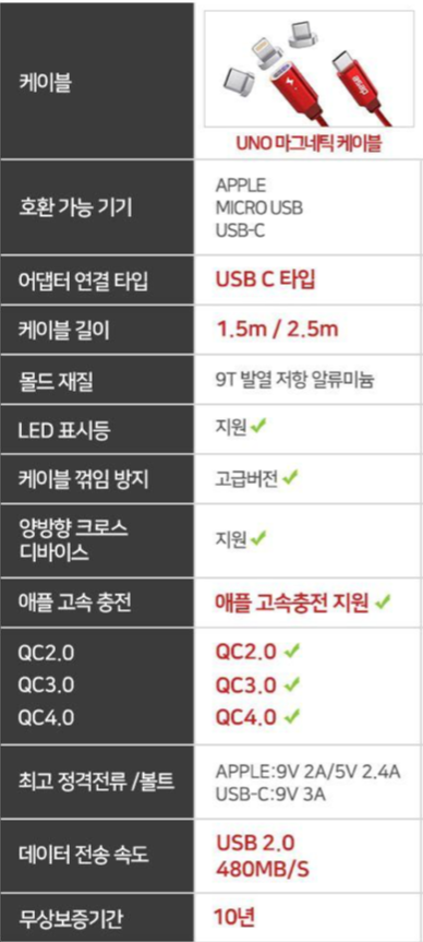 UNO(유노? 우노?) 마그네틱 고속충전 케이블 특징