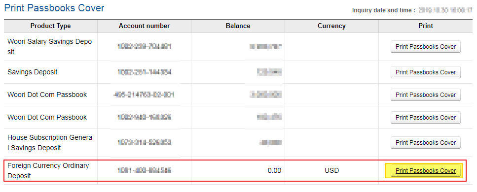 화면에 보유 계좌들이 나오는데 여기서 맨아래 통화가 "USD"로 된 계좌의 오른쪽에 "Print Passbooks Cover"를 눌러줍니다.