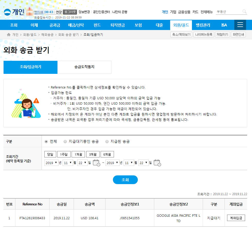 지금대기중인 돈이 보입니다. 구글에서 보내준 금액이 그대로 도착해 있네요. 계좌입금을 눌러줍니다.
