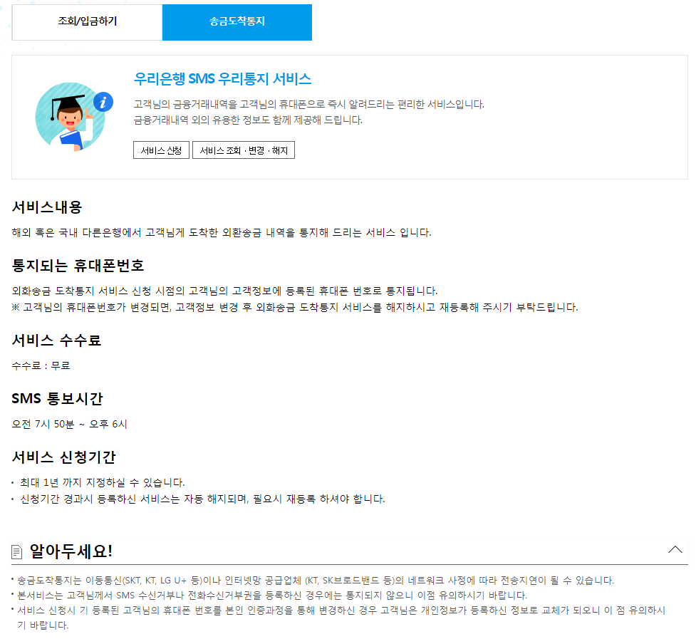 나중에 광고비가 도착했는데 통장으로 입금할 시점을 놓쳐서 이번처럼 지점에서 임의처리하고 수수료 5천원을 떼이는 불상사를 막기위해서 돈이 도착을 하면 즉시 핸드폰 문자로 알려주는 서비스를 신청해 두었습니다. "외환/골드 >> 해외송금 >> 외화 송금 받기" 메뉴에서 "송금도착통지" 라는 서비스를 신청하면 되는데요. 이용료는 무료입니다. 대신 최대 1년까지 신청이 가능하니 1년이 지나면 다시 신청을 해주어야 합니다.