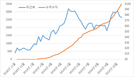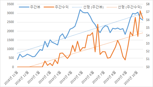 지난 1년간 역대 최대 기록으로는 주간 뷰 3000회 이상이었는데 뷰가 많아지니 수익도 어느정도 따라 올라와주는 모습을 보였습니다. 그리고 뷰수에 따라서 누적수익 증가율에 어느정도 상관성이 보이는 것처럼 보이네요. 희망적인 기대를 가져본다면 뷰가 많아 지면 많아 질 수록 수익 증가폭이 좀더 커지지 않을까 싶기도 하네요.