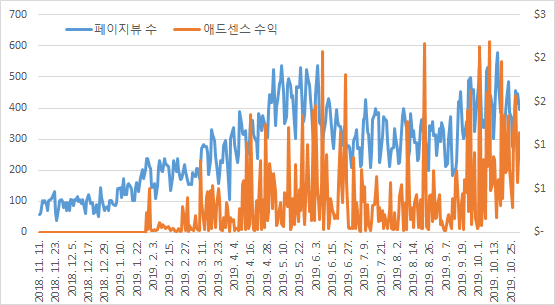 애드센스 승인후 1년간 일별 페이지뷰 수와 수익