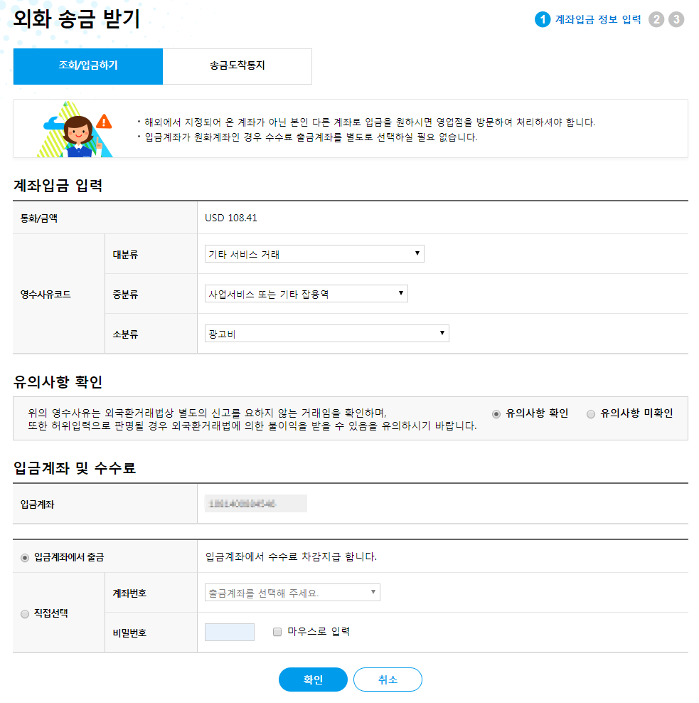돈을 받게된 사유를 입력해야 하구요. 그리고 수수료를 어떻게 지불할건지 선택을 합니다. 송금받은 돈에서 차감할 수도 있고 보유계좌 잔고에서 지불할 수도 있습니다. 그리고 확인을 누르면 이제 계좌이체 페이지로 넘어갑니다. (여기서 분명히 수수료 5천원인거 확인했는데 시간좀 끌었다가 당했어요. 여러분들 조심하세요.)