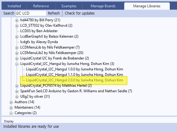 그리고 'Manage Livraries' 탭에서 'i2c', 'lcd' 라는 검색어로 검색을 해주면 많은 라이브러리들을 확인할 수 있는데요. 그중에서 저는 한글사용이 가능해 보이는 라이브러리가 눈에 보여서 이걸 사용해 보기로 했습니다. 클릭해서 라이브러리 설치를 합니다.