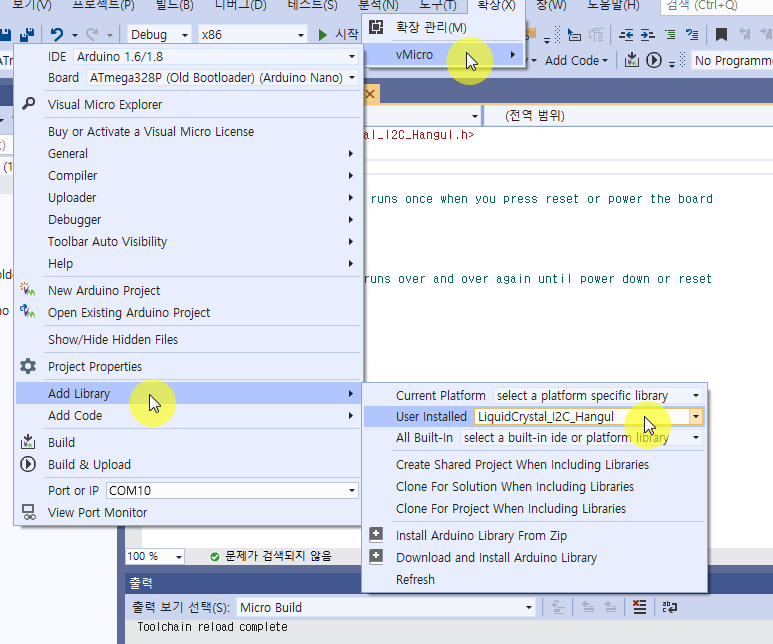 프로젝트를 만든 다음 먼저 설치했던 라이브러리를 추가해 줘야 겠죠. 아래 그림처럼 메뉴를 따라가서 설치했던 'LiquidCrystal_I2C_Hangul' 라이브러리를 선택해서 소스코드에 추가합니다.
