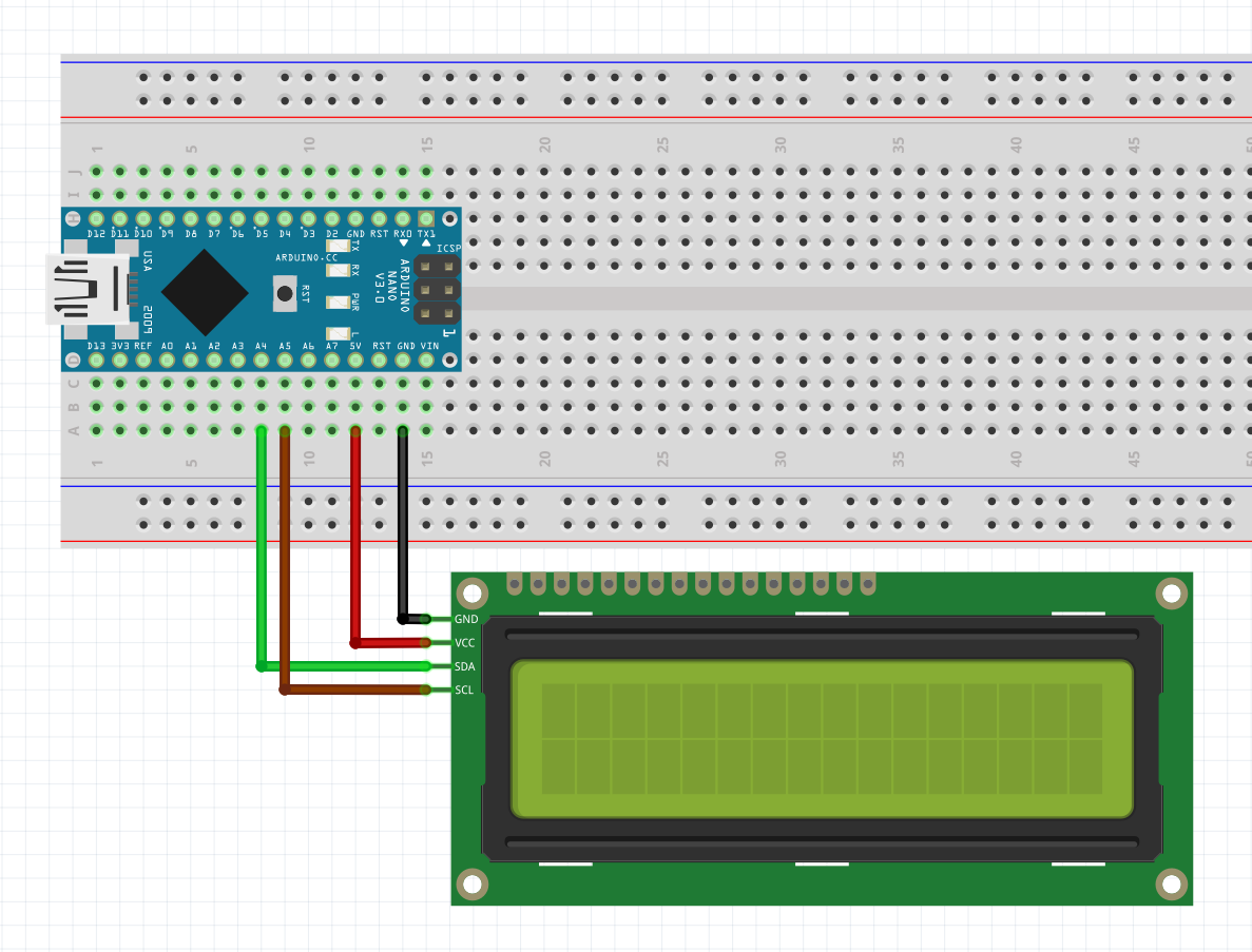 아두이노와 I2C 모듈이 있는 LCD 그리고 케이블들만 준비하시면 되겠습니다. (여기에서는 아두이노 나노 사용했습니다.)