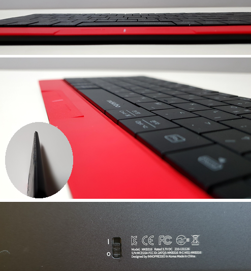 마지막으로 모키보의 전원 스위치입니다. 전원 스위치 위치가 키보드의 뒷면이라서 켜고 끌 때 상당히 불편합니다. 게다가 스마트 커버를 사용하면 아주 커버 안으로 들어가 버리기 때문에 켜고 끌 때마다 커버를 떼어내야 하는 불편함이 있습니다. 디자인 의도가 전원을 끄지 않고 사용하는 건지도 모르겠네요. 그리고 스위치 자체도 전체적인 분위기와 맞지 않게 너무 저렴해 보이는 것도 아쉬운 점입니다.