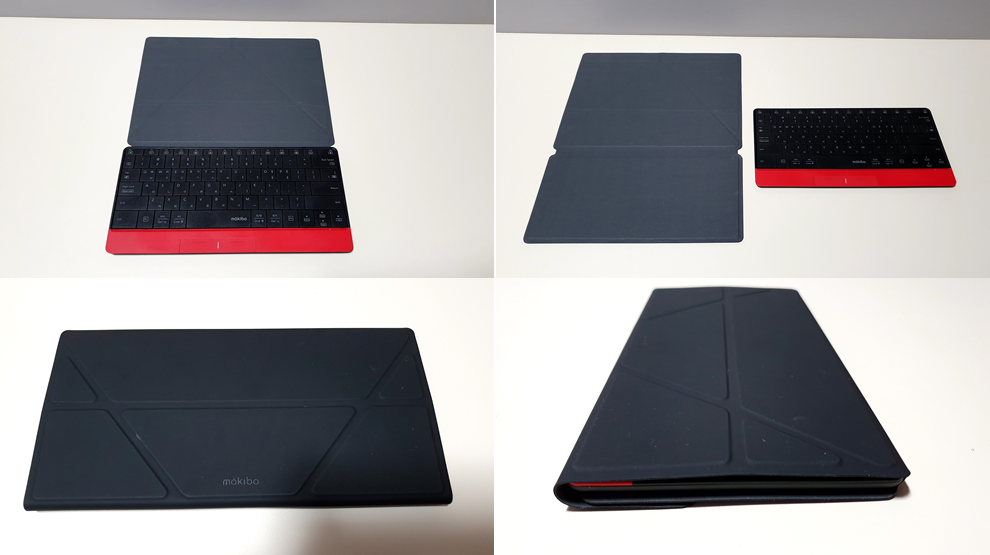 모키보는 키보드의 각도 조절이 불가능합니다. 그리고 매우 납작하게 만들어져 있기 때문에 키보드 뒤쪽을 약간 세워서 경사지게 사용하는 걸 좋아하시는 분들은 타이핑 자세가 불편하다고 느끼실 수 있는데요. 스마트커버의 뚜껑 부분을 뒤집어서 키보드 밑으로 집어넣게 되면 자연스러운 각도가 만들어집니다.