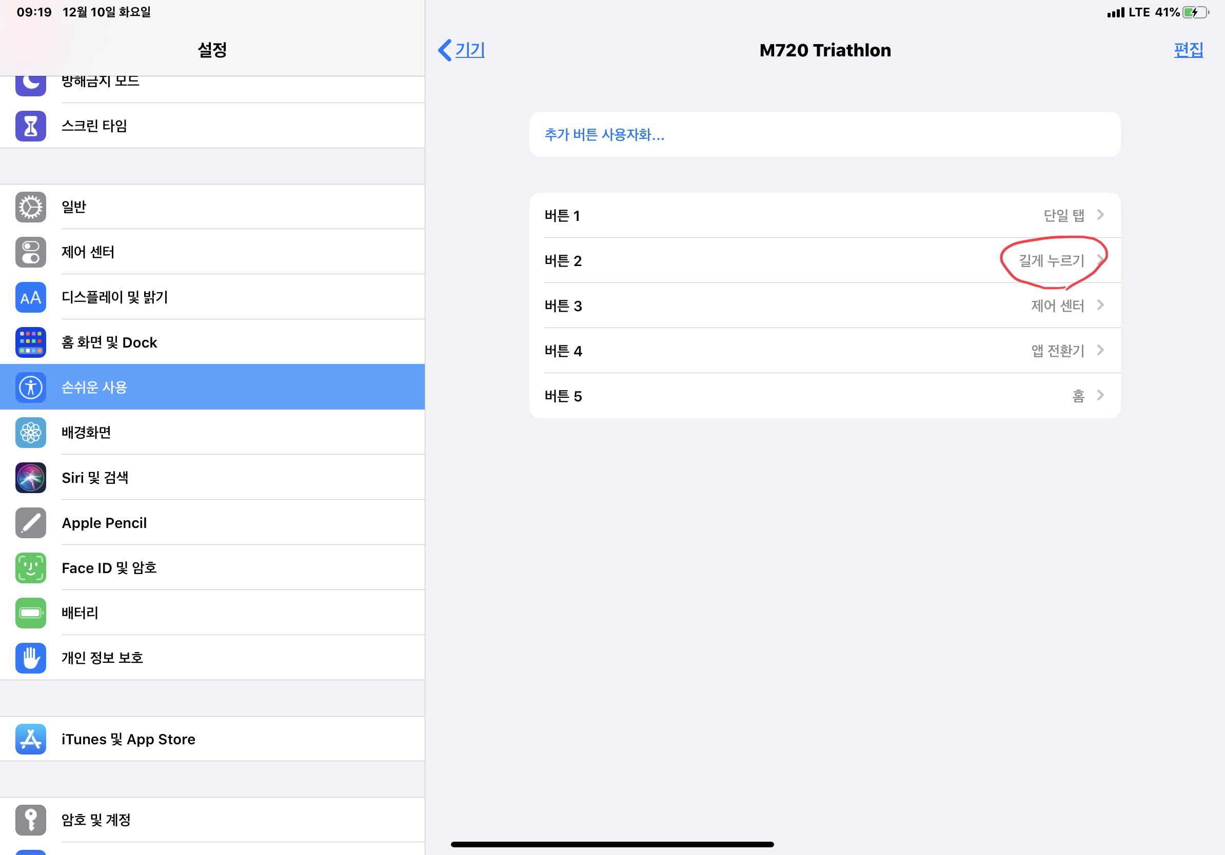 하지만 IPadOS에서 "손쉬운 사용" 기능을 이용해서 일반 마우스로도 좀더 윈도우 친화적인 사용이 가능합니다. 현재 RDP에서 마우스를 공식 지원하지 않아서 답답한 부분은, 마우스의 우클릭과 휠 그리고 휠 클릭이 인식되지 않는 다는 점인데요. 휠은 아얘 인식이 되지 않아 방법이 없지만 마우스 우클릭은 "버튼 사용자화"를 통해서 "길게 누리기"로 사용을 하면 마우스 우클릭이 되는것 같은 효과를 누릴 수 있습니다.