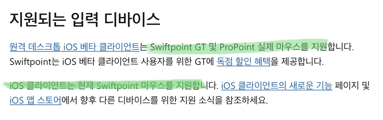 Swiftpoint GT 마우스를 공식적으로 지원하고 있다고 하네요. 예전에 아이패드에서 탈옥이 아닌방법으로 마우스를 쓸수 있는 방법으로 한번 소개한적(https://kwonkyo.tistory.com/55)이 있었던 마우스인데요. Jump desktop이라는 특정 유로앱과 Swiftpoint GT의 조합으로 윈도우에서처럼 완벽하게 마우스를 사용할 수 있는 환경을 만들어 주었는데요. 아마도 이번 업데이트로 Jump desktop 앱과같은 기능을 지원하게 된것 같습니다.