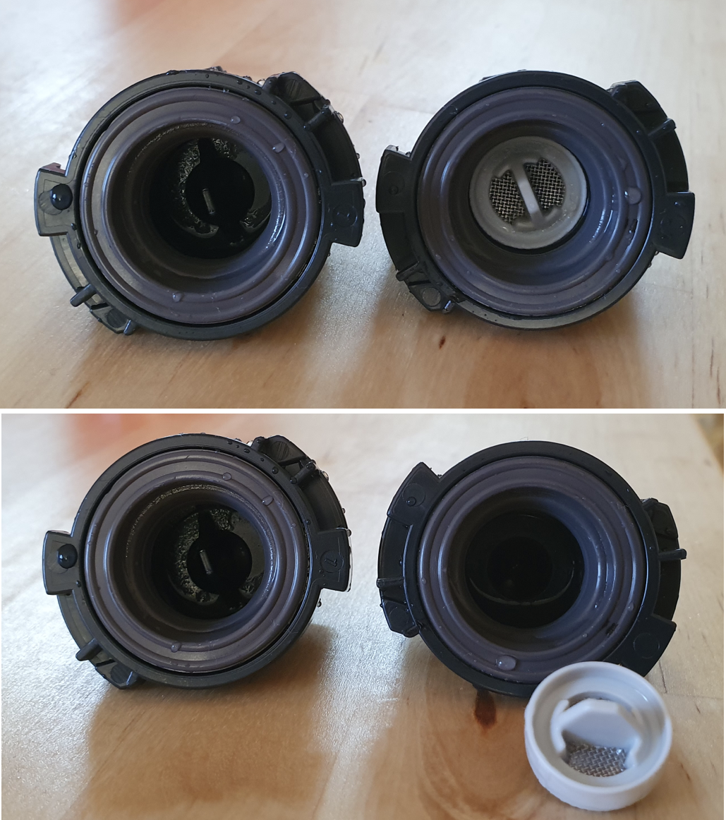 그리고 이렇게 문제가 되는 물통의 입/출구와 연결되는 노즐 부분의 분리 사진입니다. 특이한 것은 오른쪽에 있던 노즐은 별도의 필터가 들어있는데 좌측에 있던 노즐은 필터가 없습니다.