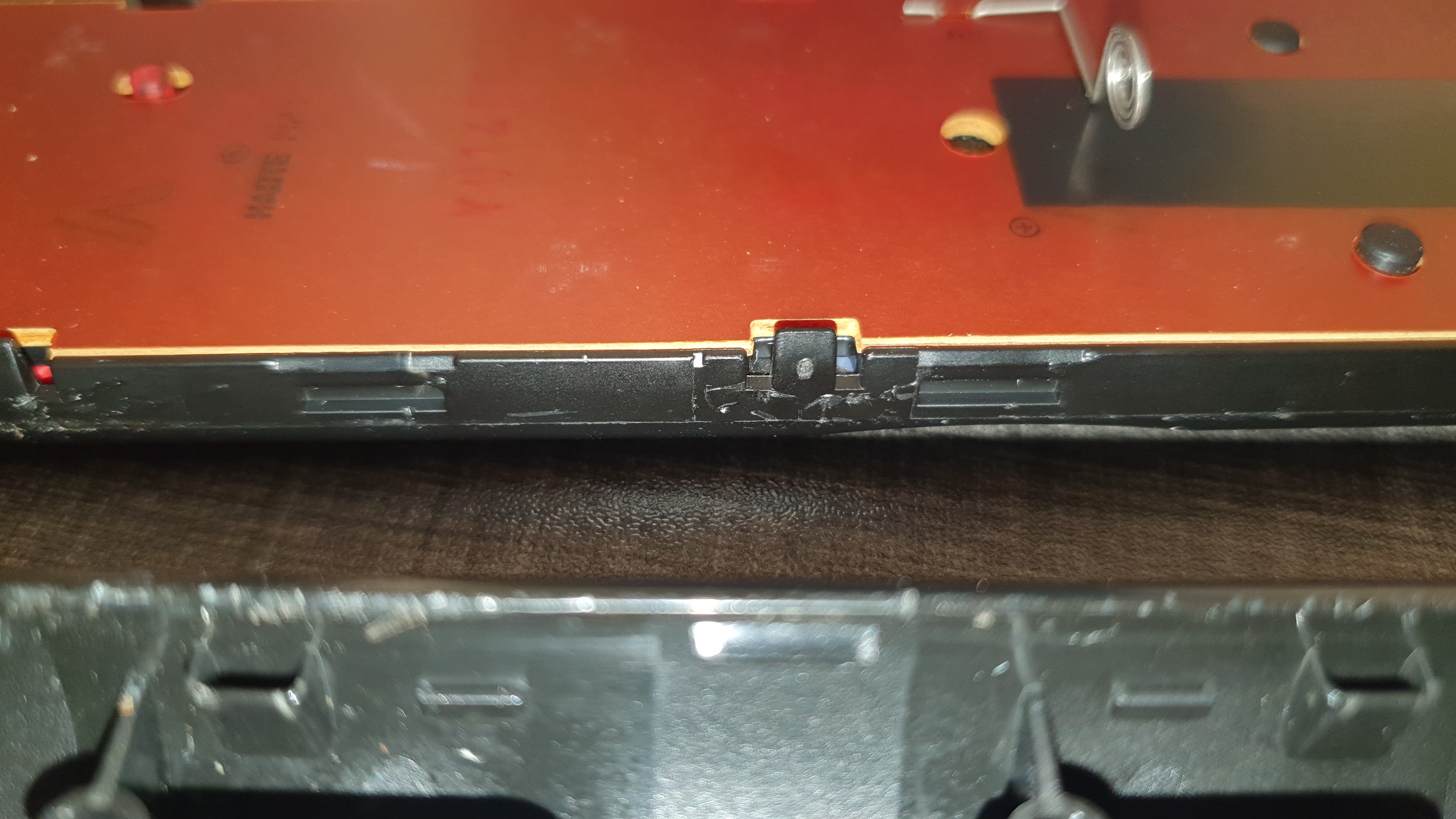 총 10개의 걸쇠가 리모컨의 상 하판을 단단히 물고 있습니다. 드라이버로 제법 힘을 줘서 쑤셨는데 다행히 작은 긁힘말고는 큰 손상 없었습니다.