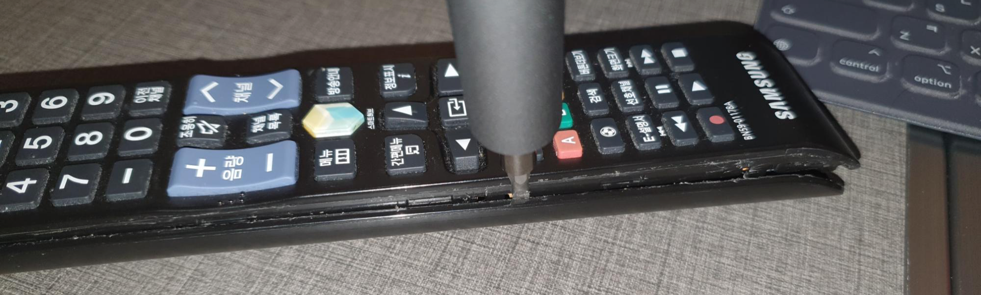 삼성 TV사용하고 있는데요. 어느날 갑자기 전원버튼이 잘 안눌려지기 시작했습니다. 다른 버튼들은 다 잘되는데 전원만 안되고, 집에 애기가 있는데 리모컨을 물어씹고 한적도 있어서 뭔가 이물질이 들어갔구나 싶어서 리모컨 분해 및 청소를 해 봤습니다.