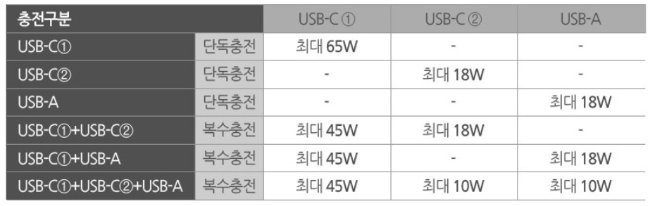 포트구성은 앞서 말씀드린것 처럼 C타입 2개에 A타입 1개인데 C타입 2개중 1개는 최대 65W까지 충전이 가능하고 (PD1) 다른 하나는 18W까지만 충전되는 포트(PD2)입니다.