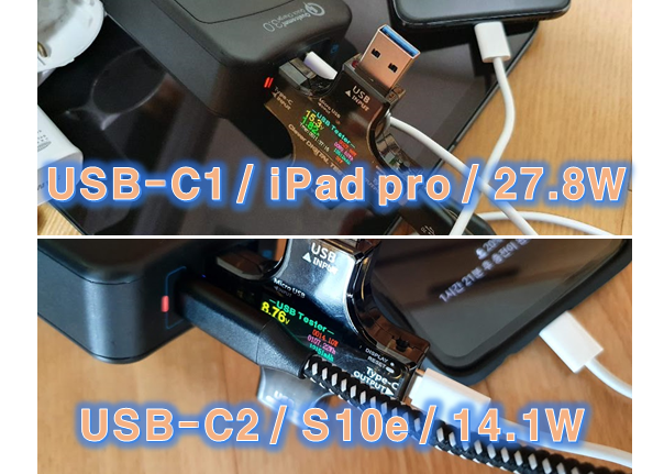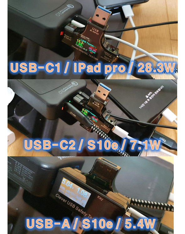 먼저 C포트 1번은 S10e는 14.9W로 핸드폰의 충전속도 최대치에 육박하게 충전이 되고. 아이패드는 28.3W로 30W에는 살짝 못미치는 결과가 나왔습니다. 그렇지만 기기가 허용하는 최대속도는 거의 뽑아내주고 있습니다. (30W이상 충전속도는 뒤에 따로 적겠습니다.)