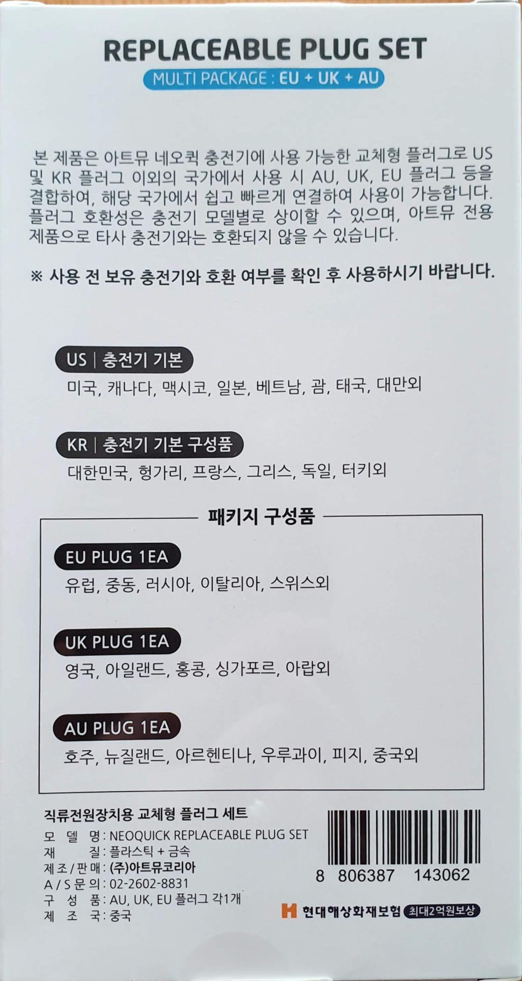별도 구성인 교환식 플러그는 총 3개의 타입이 들어있는데요. 기본 구성인 220V플러그와 같이 조합을 하면 전세계 어디에서든 사용이 가능합니다.