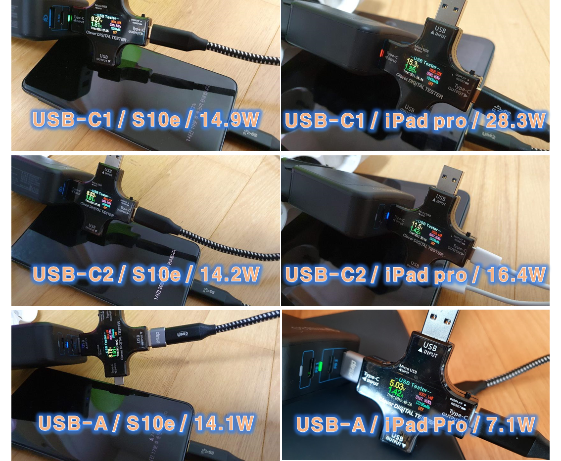 마지막으로 A포트도 최대 18W지원을 하며 결과는 S10e 14.1W, iPad 7.1W를 보여주었습니다. 아이패드의 경우 제가 가지고 있는 케이블중에 A to C type의 케이블이 없어서 중간에 아답터를 사용했는데요. 충전시 케이블 특성을 많이 타는 특성상 이런 의외의 결과가 나온게 아닌가 싶습니다.