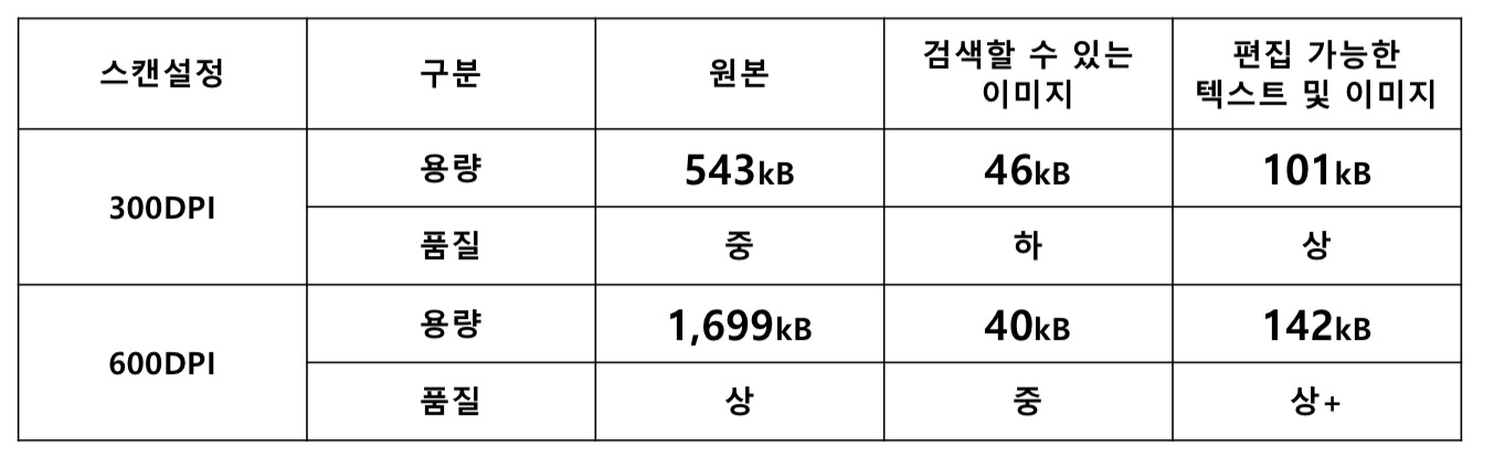 위 표는 결과를 비교해서 정리한 것인데요. 먼저 후처리를 위한 PDF 샘플은 앞서 설명한것처럼 300DPI와 600DPI 두가지로 준비를 하고 이것을 "검색할 수 있는 이미지"로 처리를 한것과 "편집 가능한 텍스트 및 이미지"로 처리를 한것 그리고 아무것도 하지 않은 원본의 3가지 결과물을 텍스트 품질과 용량에 대해서 비교를 한 것입니다.