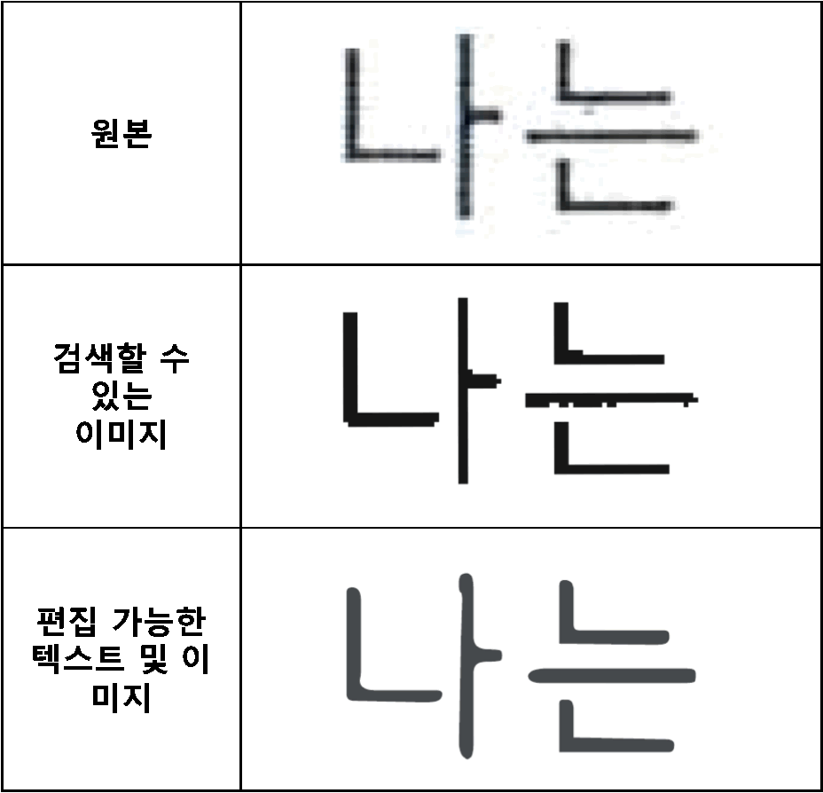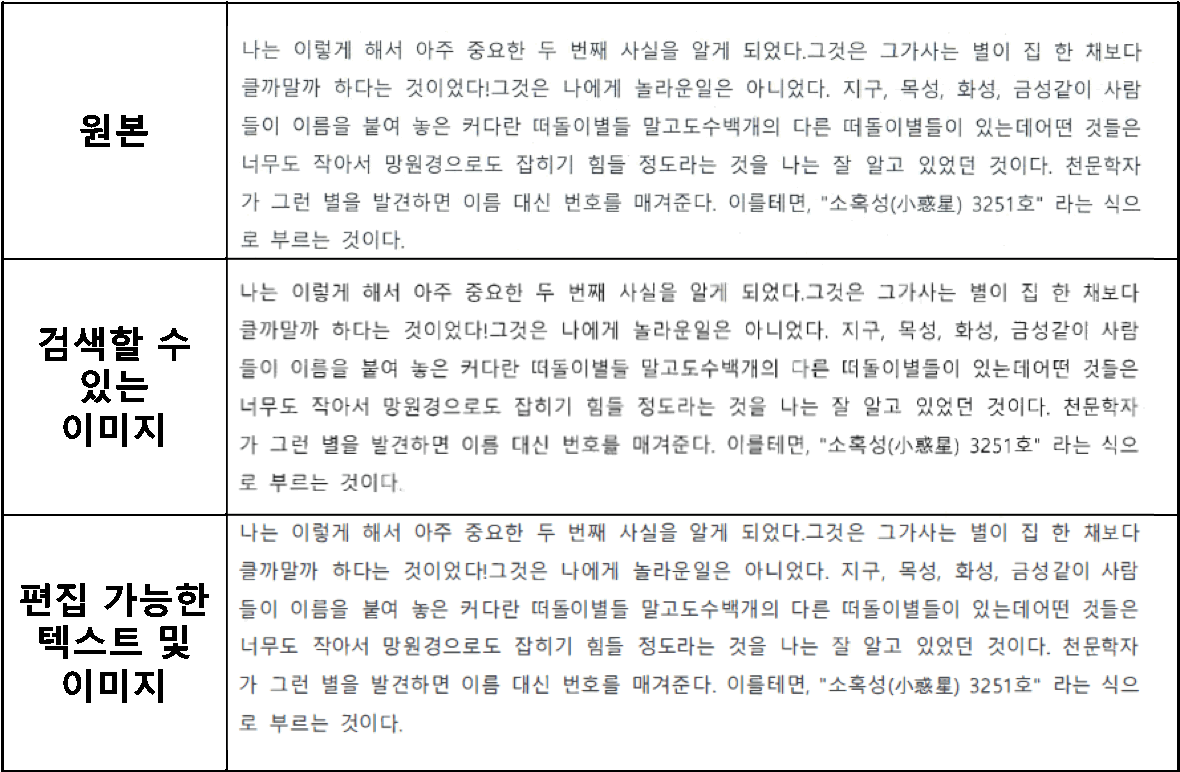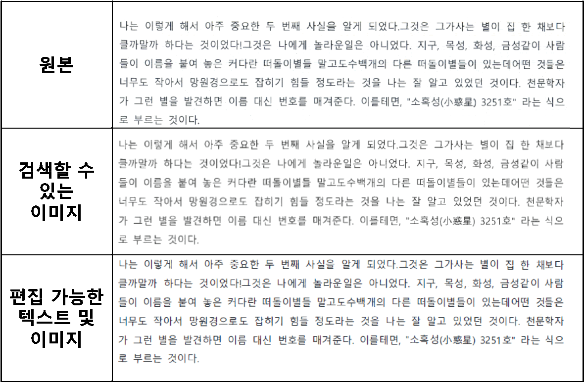 그리고 "검색할 수 있는 이미지"와 "편집 가능한 텍스트 및 이미지" 이 2가지 후처리 옵션에 대해서는 결과물의 장단이 극명하게 구분이 되어 결과물의 용도에 따라 상황에 맞는 선택을 할 수 있을 것 같았습니다.