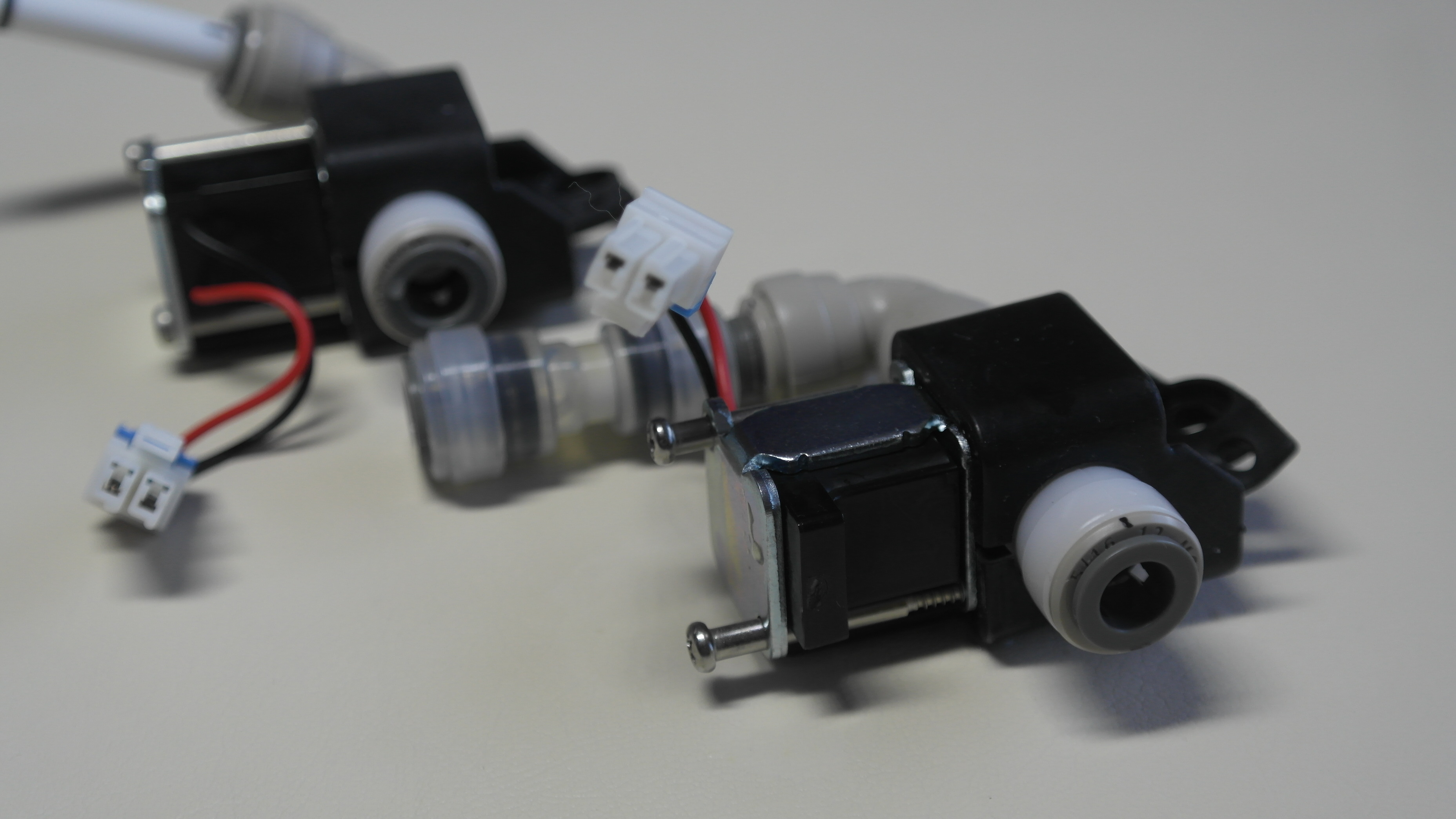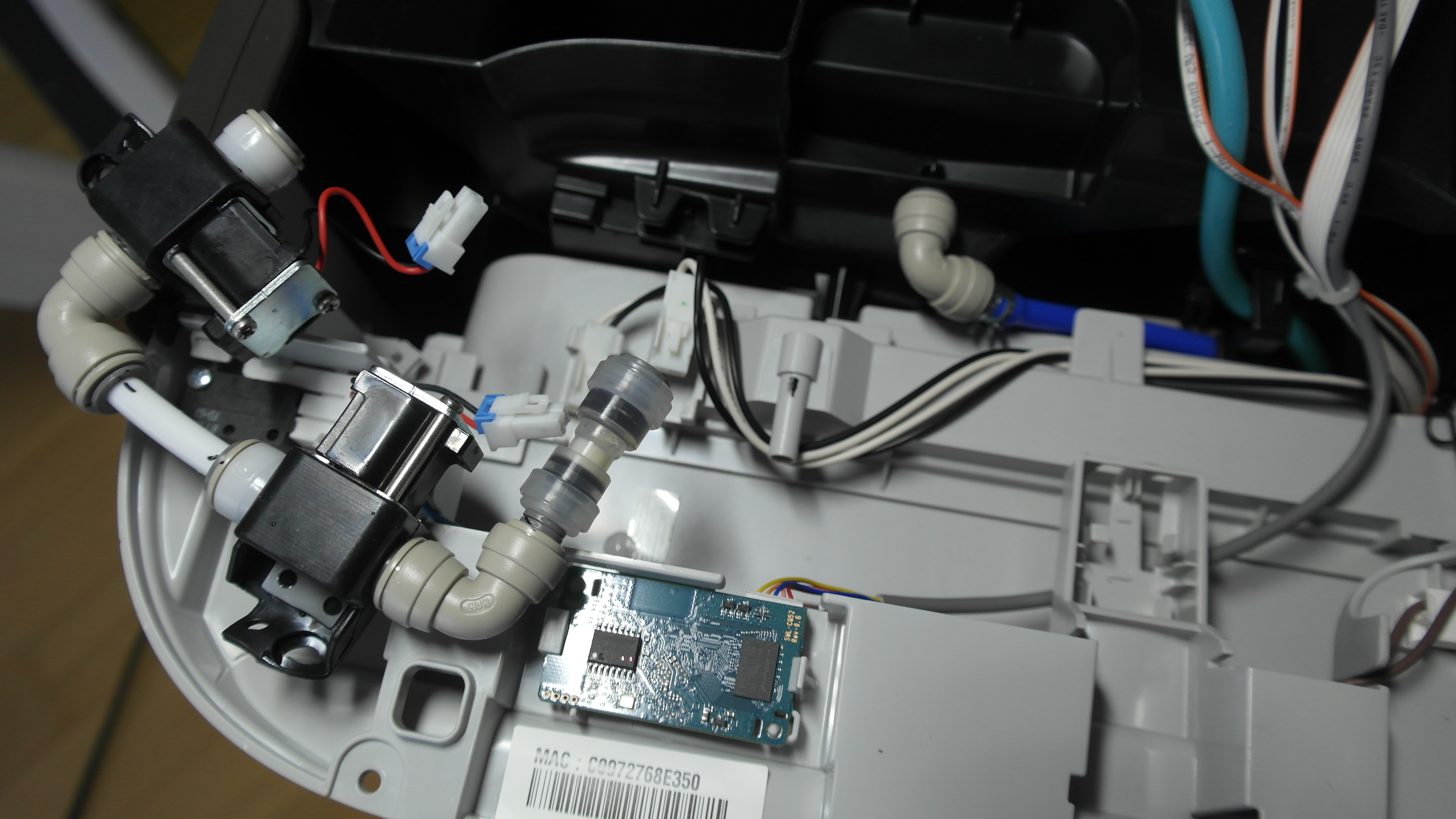 조립한 상태에서 가습을 작동시켜보면 솔레노이드 밸브는 신호가 들어가면 찰칵하는 동작소리가 들리는데요. 밸브 2개중에 1개가 아무런 반응이 없었습니다. 그러니까 가습동작을 하면 밸브 2개가 모두 열려야 물이 아래로 내려가서 가습망을 적시고 물이 순환을 하는데 밸브가 열리지를 않으니 가습이 안되는거죠.