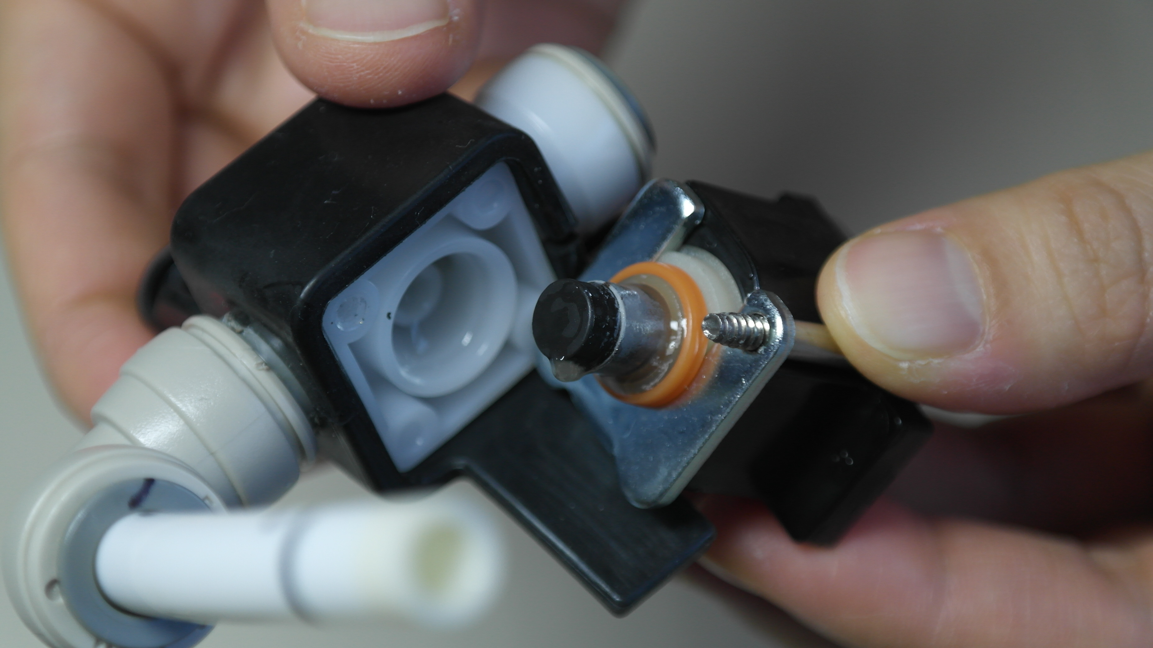 중간중간 연결된 부분에서는 막힌곳도 없고 깨끗합니다. 사실 여기는 깨끗한 물이 지나가는 곳이고 물통 출구에 필터도 있기 때문에 이물질로 막히긴 어려울것 같지만 여기까지 분리했으니 밸브도 분해해 봅니다.