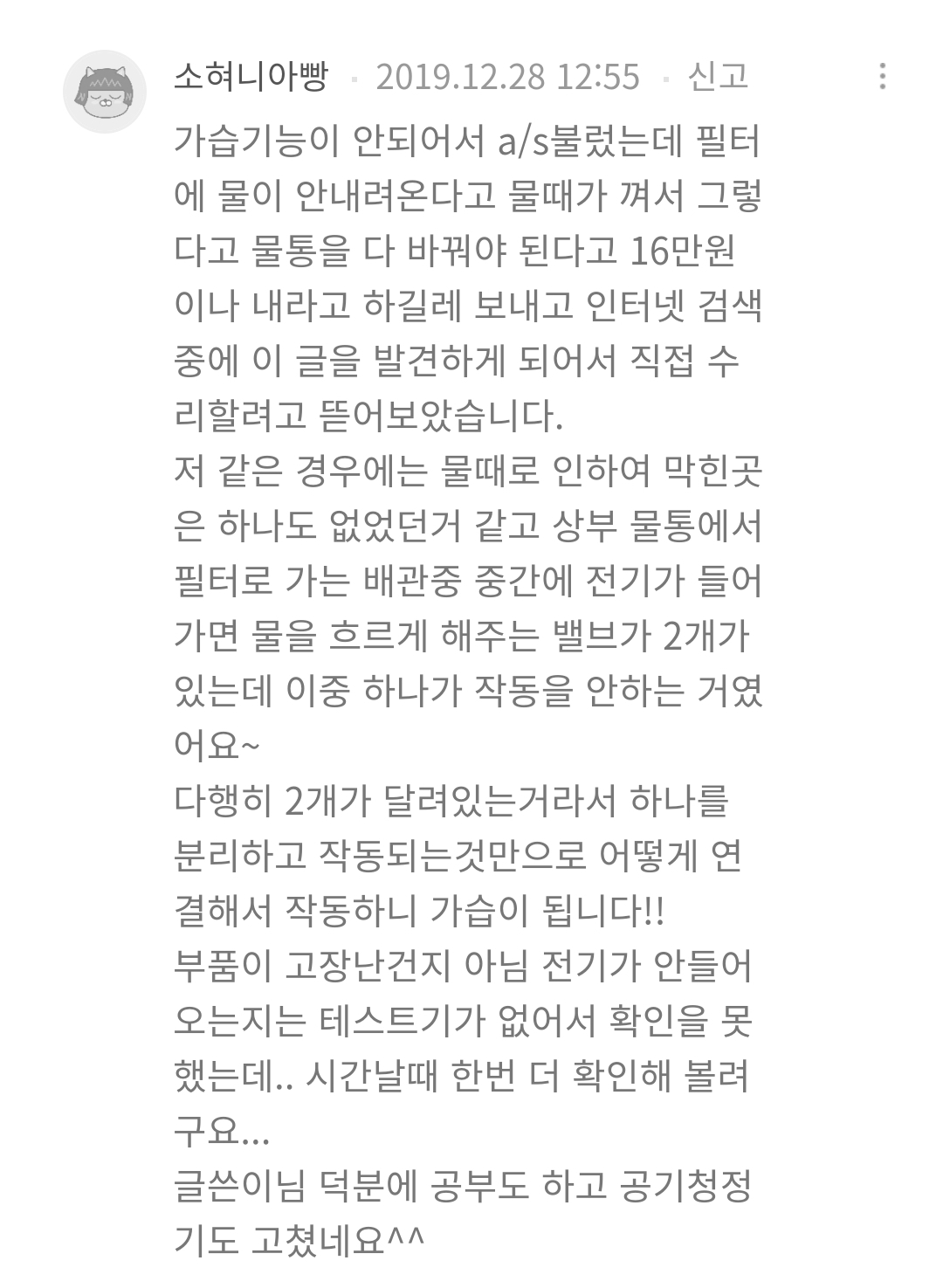 작년 12월 제 블로그를 방문해주신 "삼삼삼"님께서 아래와같은 댓글을 남겨주셨습니다. 오류코드가 발생하지는 않는데 가습이되지 않고 가습망은 바짝 말라있는 상태로 문제를 격고있으심을 알려주셨습니다. 당시에는 제가 격어보지 못한 증상이어서 도움을 드리지 못했는데 다행히 기발한 아이디어로 간단히 문제를 해결하신적이 있었죠.