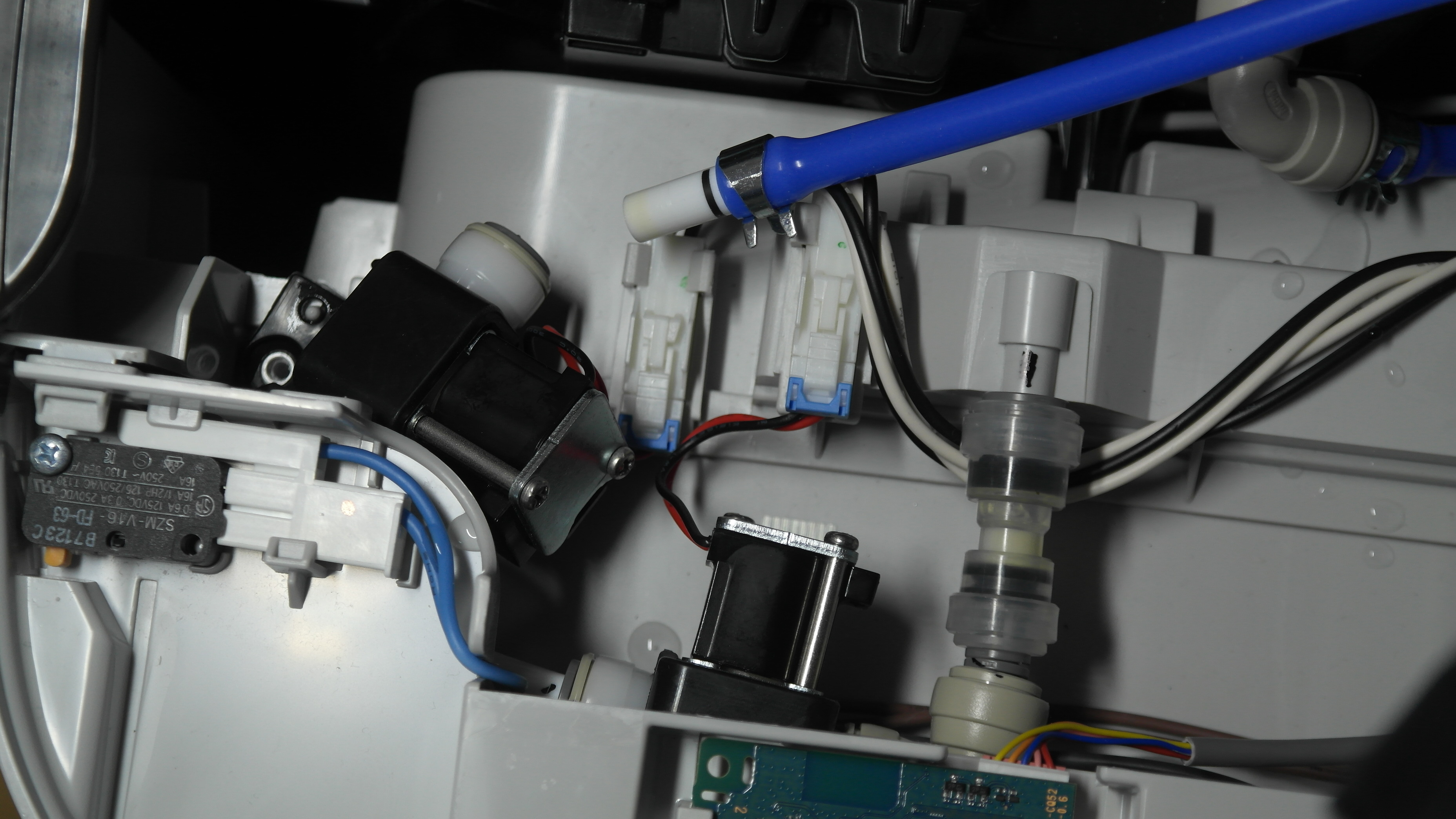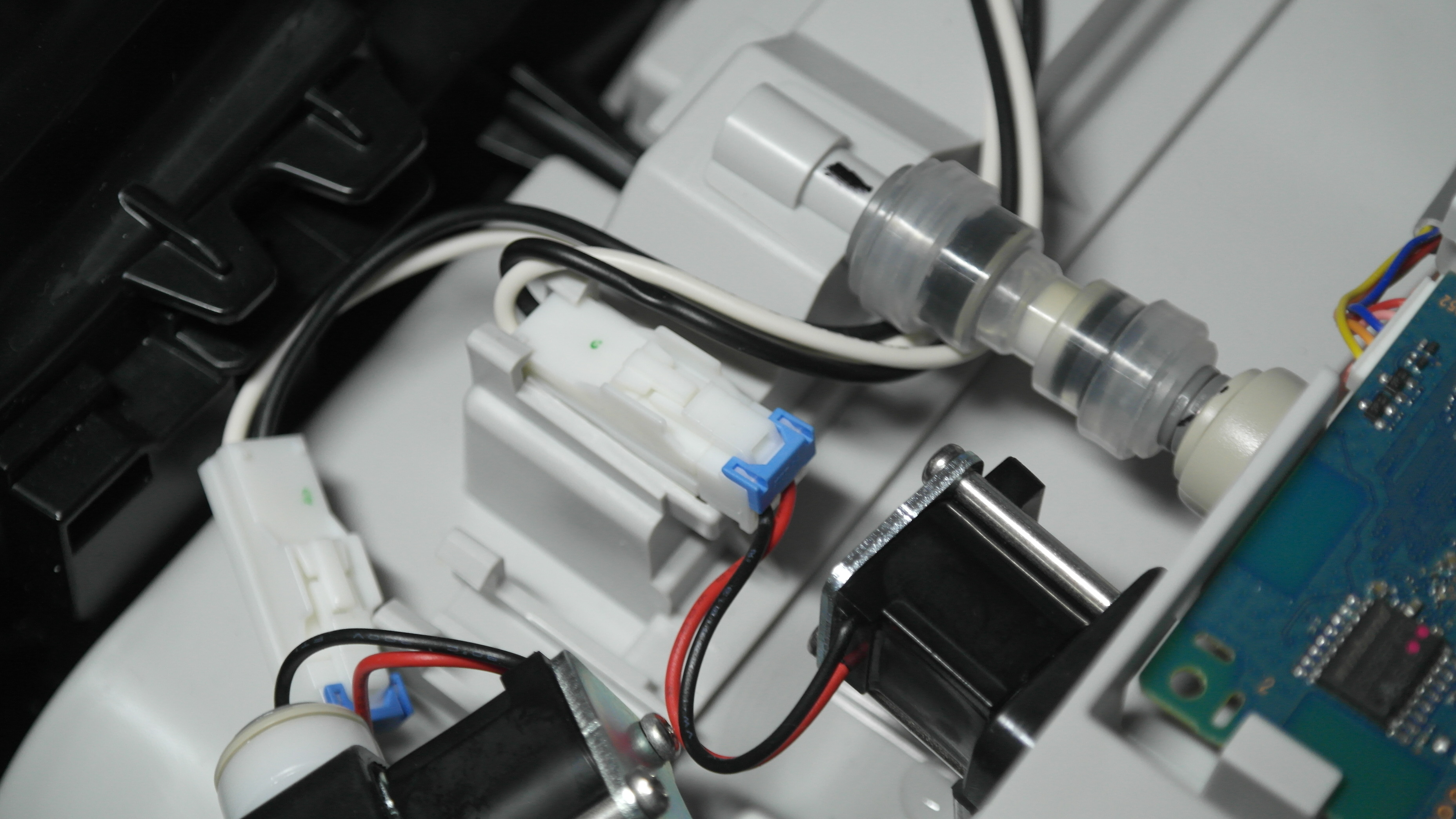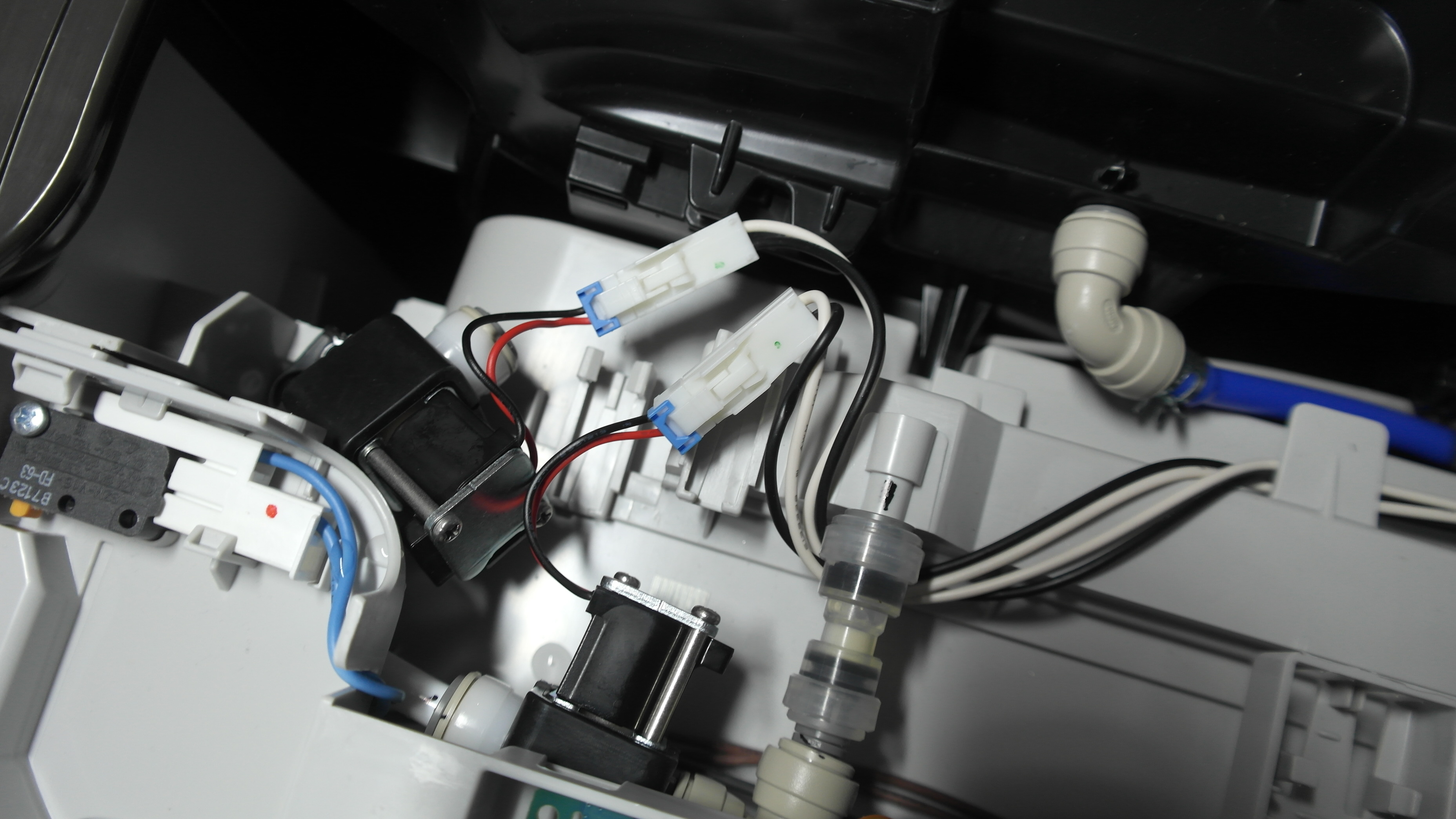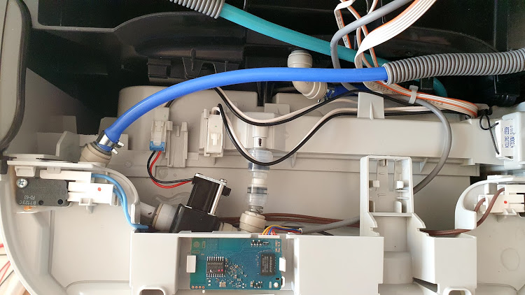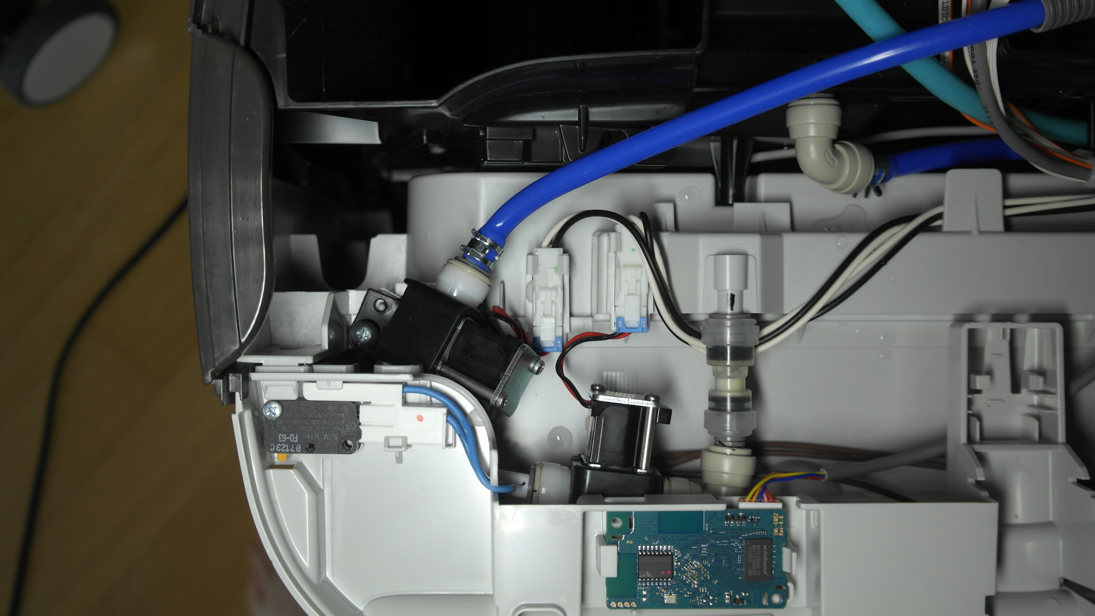 공기청정기 머리부분을 열어서 살짝 들어올려보면 본체쪽에 상부 물통에서 연결되는 파란색 호스가 연결되는 검은색 부품이 보입니다. 똑같은 부품이 2개가 직렬로 연결되어 있는데 이건 글로브타입의 솔레이노이드 밸브였습니다. (뚜겅을 여는부분은 이전 포스팅 참고해 주세요.)