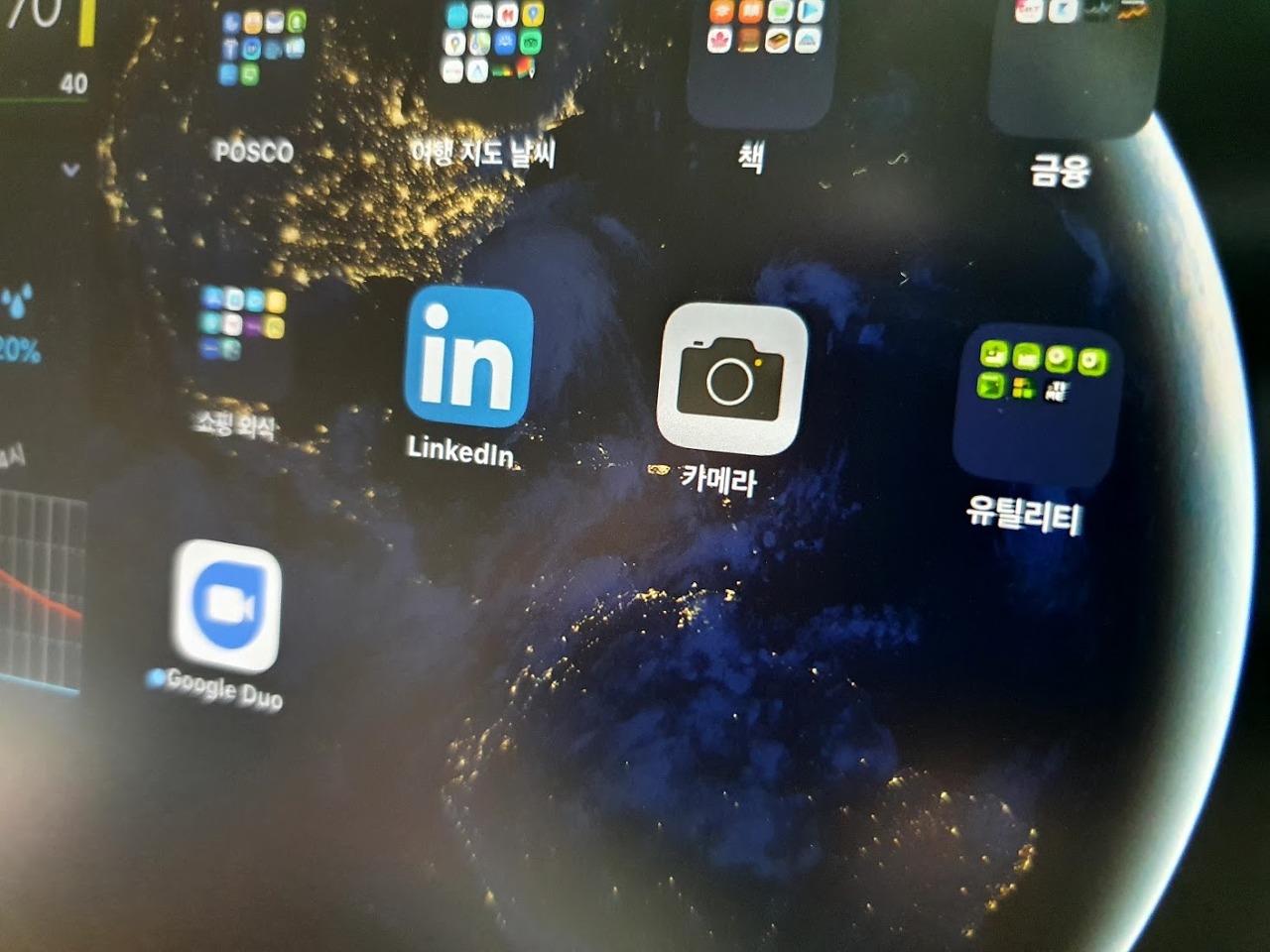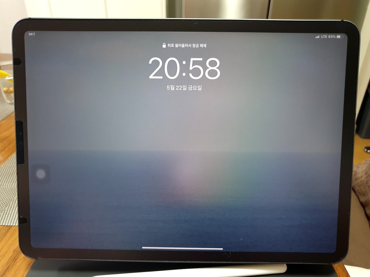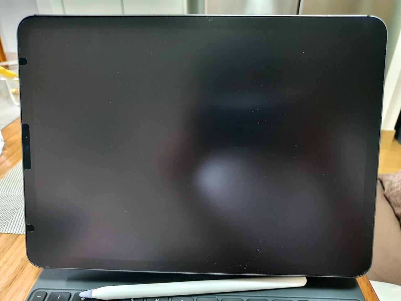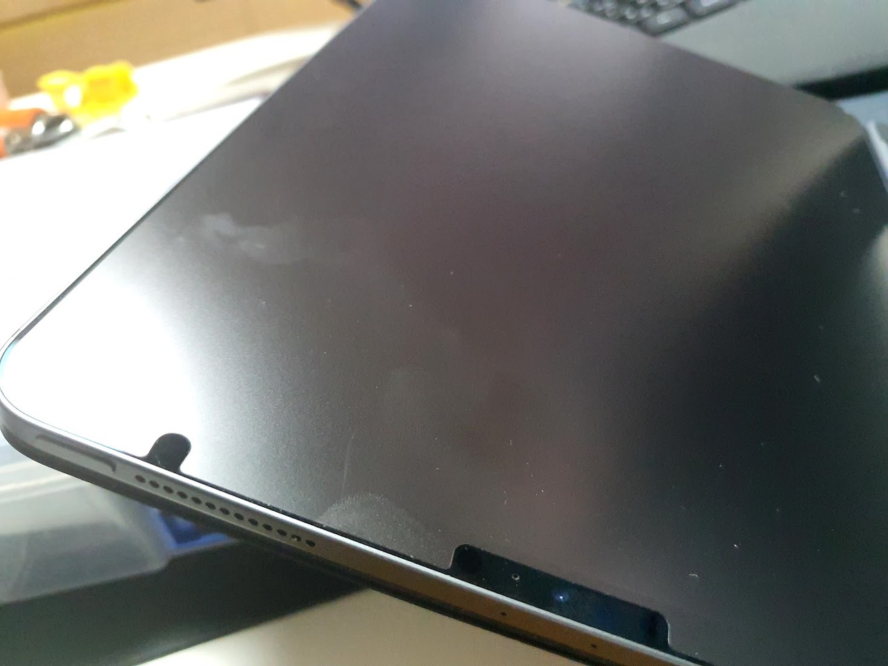 보호필름의 다양한 부가기능도 중요하지만 일단 화면이 선명하게 보여지는게 가장 중요하겠죠. 사진은 실내에서 저녁시간에 형광등아래서 찍은 사진입니다. 원래 아이패드의 화면은 반짝이는 재질인데 힐링쉴드 필름을 붙이고 나면 이렇게 불투명한 유리를 보는것처럼 됩니다. 화면이 꺼진상태에서 더이상 거울로는 사용할수 없도록 빛이 뭉개져서 반사됩니다. 아래는 화면이 켜졌을 때 입니다.